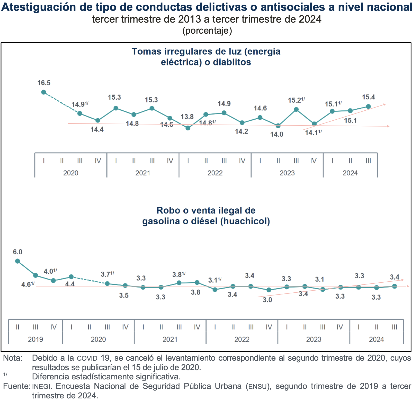 Información de la Encuesta Nacional de Seguridad Pública Urbana (ENSU), que publica el Instituto Nacional de Estadística y Geografía (Inegi) revela un crecimiento en el robo de combustibles y electricidad en el 2024.