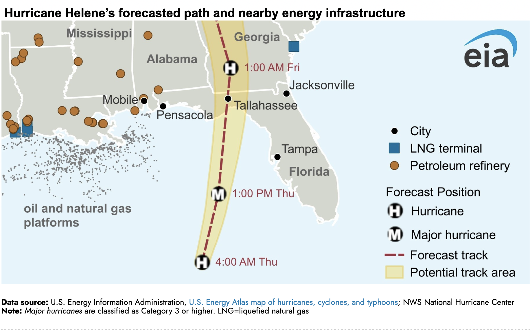 A partir de las 8:00 a.m. hora del este del 26 de septiembre, se esperaba que el huracán Helene tocara tierra como huracán de categoría 3 en la parte oriental del Panhandle de Florida a última hora del jueves con vientos sostenidos de 115 millas por hora, creando el potencial de interrupciones significativas en la infraestructura energética. El huracán Helene es el huracán más fuerte que ha tocado tierra en los Estados Unidos esta temporada de huracanes. Las otras tres tormentas con nombre que tocaron tierra hasta ahora en esta temporada de huracanes (Beryl, Debby y Francine) fueron huracanes de categoría 1 o 2.