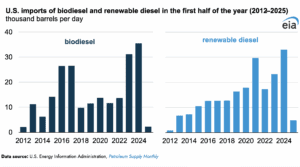 Las importaciones estadounidenses de biodiésel y diésel renovable disminuyeron significativamente en la primera mitad de 2025 (1H25) en comparación con el mismo período de años anteriores. Esta disminución se debe principalmente a la pérdida de créditos fiscales para los biocombustibles importados y, en general, a un menor consumo interno de estos combustibles.
