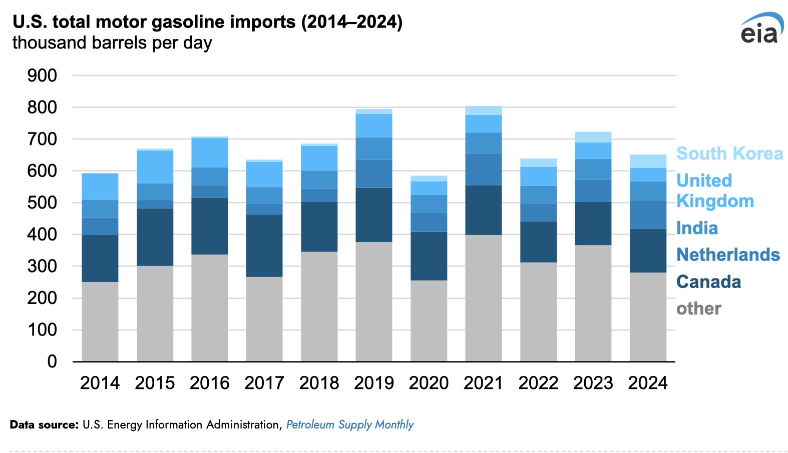 La gasolina de motor representa la mayor parte de las importaciones de productos petrolíferos de los Estados Unidos porque es el combustible de petróleo más consumido en los Estados Unidos. En 2024, los Estados Unidos importaron 651,000 b/d de gasolina de motor, alrededor del 36 % de todas las importaciones de productos petrolíferos y 75,000 b/d menos que en 2023. El consumo de gasolina de EE. UU. en 2024 cambió en gran medida con respecto a 2023; los inventarios cayeron en 2024 después de haber aumentado en 2023, lo que refleja la disminución de las importaciones.