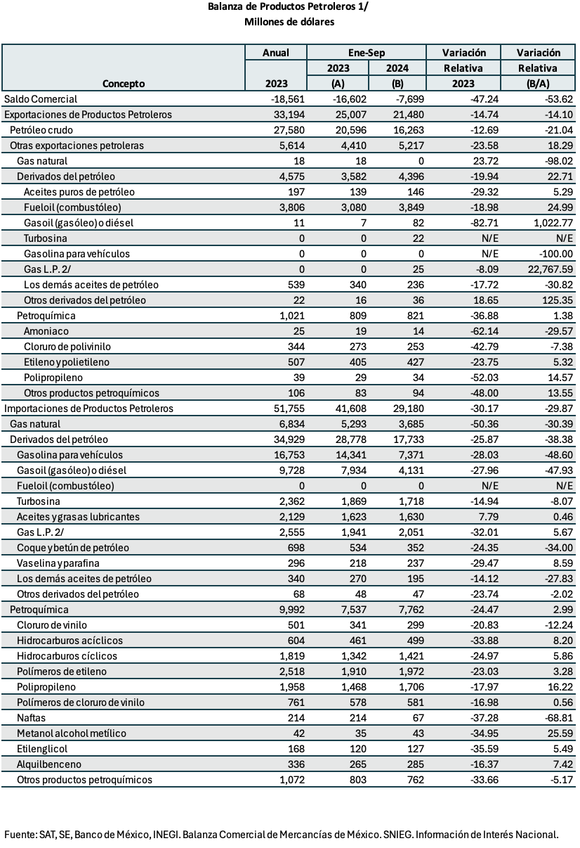 Durante octubre de 2024, el déficit de la balanza comercial petrolera fue de -859 millones de dólares, el nivel más bajo de los últimos tres meses, indica información del Instituto Nacional de Estadística y Geografía (Inegi).