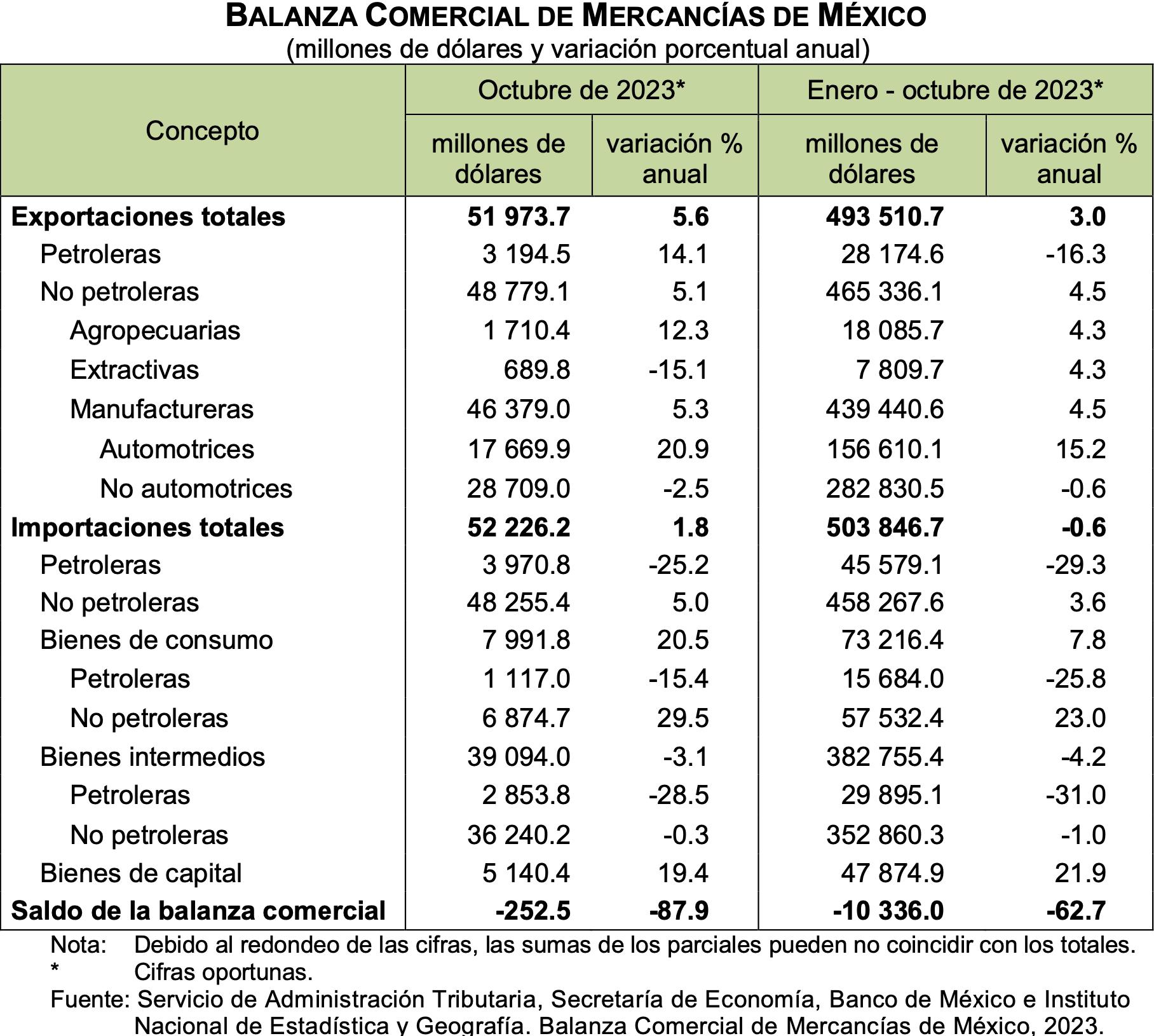 En los primeros diez meses de 2024, la balanza comercial presentó un déficit de 10 646 millones de dólares. En el mismo periodo de 2023, el déficit fue de 10 295 millones de dólares.