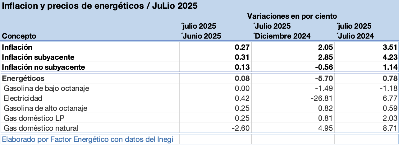 En julio los otros energéticos: la electricidad subió 0.42%; el gas doméstico LP 0.25%; mientras que el gas doméstico natural reportó un baja de -2.60%.
