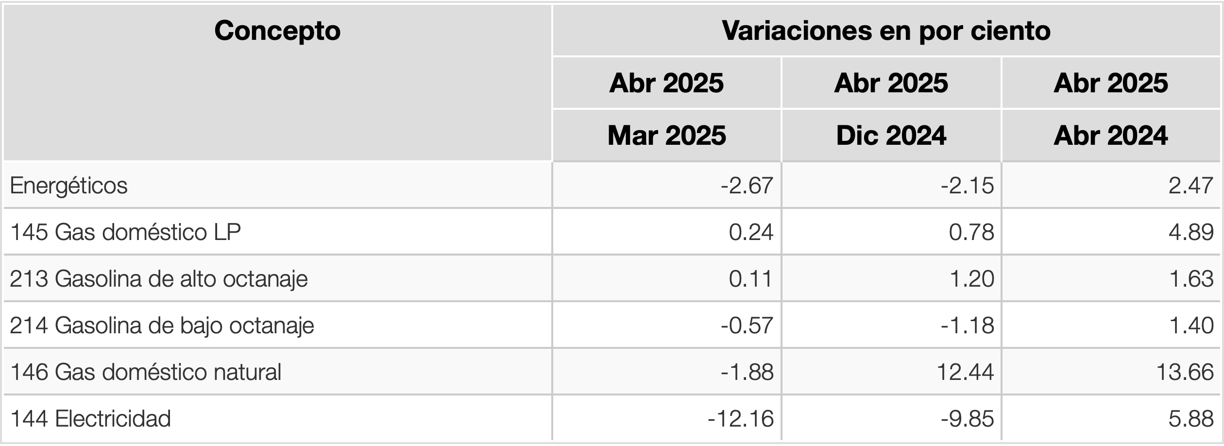 En los que va del 2025, los energéticos reportan una baja de -2.15% promedio, en el que las tarifas de electricidad registran bajas de 9.85%, mientras que la gasolina de bajo octanaje -1.18%.