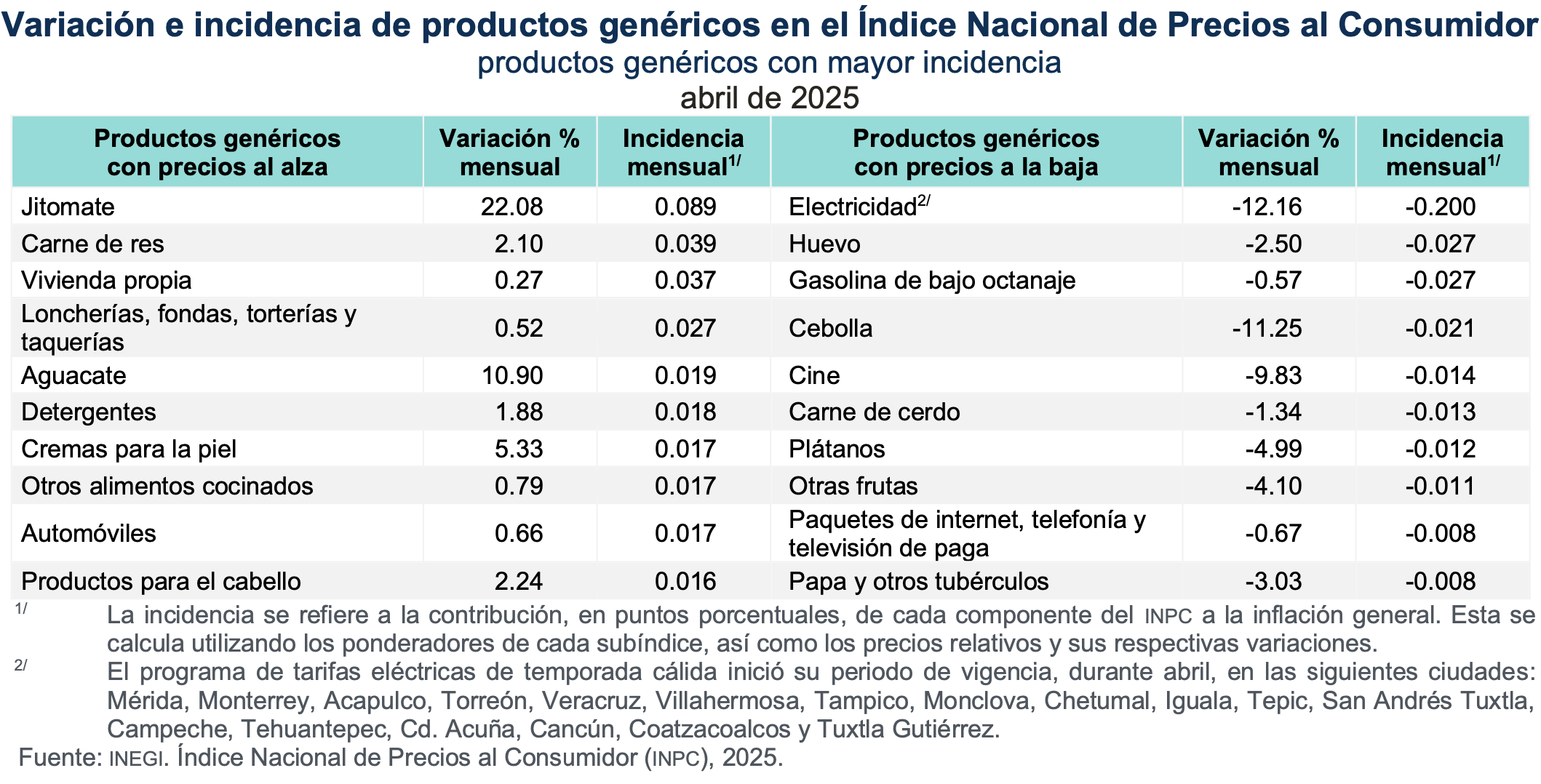 En abril de 2025, los productos genéricos con mayores alzas y que destacaron por su incidencia sobre la inflación general fueron los siguientes: jitomate (22.08), carne de res (2.10%), vivienda propia (0.27%), así como loncherías , fondas, torterías y taquerías (0.52%). En contraste, con las mayores bajas, la electricidad (-12.16%), el huevo (-2.50%), la gasolina de bajo octanaje (-0.57%) y la cebolla (-11.25%).