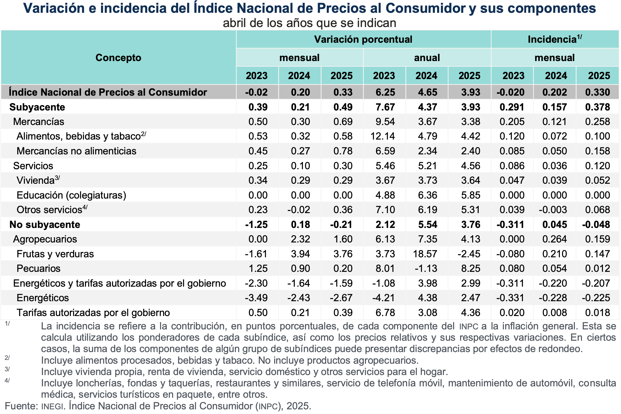 En abril de 2025, el Indice Nacional de Precios al Consumidor (INPC) aumentó 0.33 % respecto al mes anterior. Con este resultado, la inflación general anual se ubicó en 3.93 por ciento. En el mismo mes de 2024, la inflación mensual fue de 0.20 % y la anual, de 4.65 por ciento.