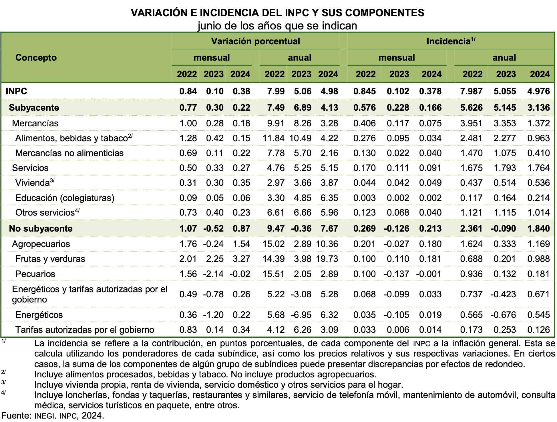 En junio de 2024, el INPC presentó un aumento de 0.38 % respecto al mes anterior. Con este resultado, la inflación general anual se ubicó en 4.98 por ciento. En el mismo mes de 2023, la inflación mensual fue de 0.10 % y la anual, de 5.06 por ciento, informó el Instituto Nacional de Estadística y Geografía (Inegi).