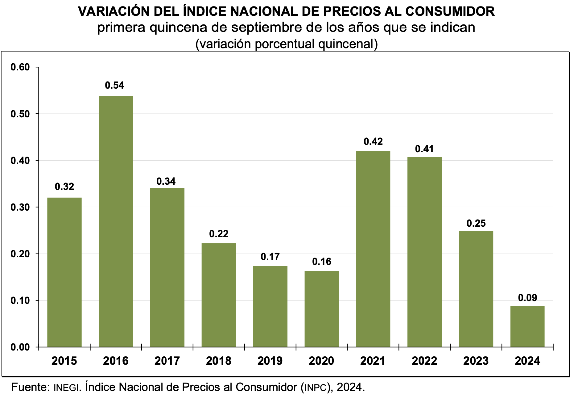 En la primera quincena de septiembre de 2024, el INPC presentó un incremento de 0.09 % respecto a la quincena anterior. Con este resultado, la inflación general anual se ubicó en 4.66 por ciento. En la misma quincena de 2023, la inflación quincenal fue de 0.25 % y la anual, de 4.44 por ciento, informó el Instituto Nacional de Estadística y Geografía (Inegi).