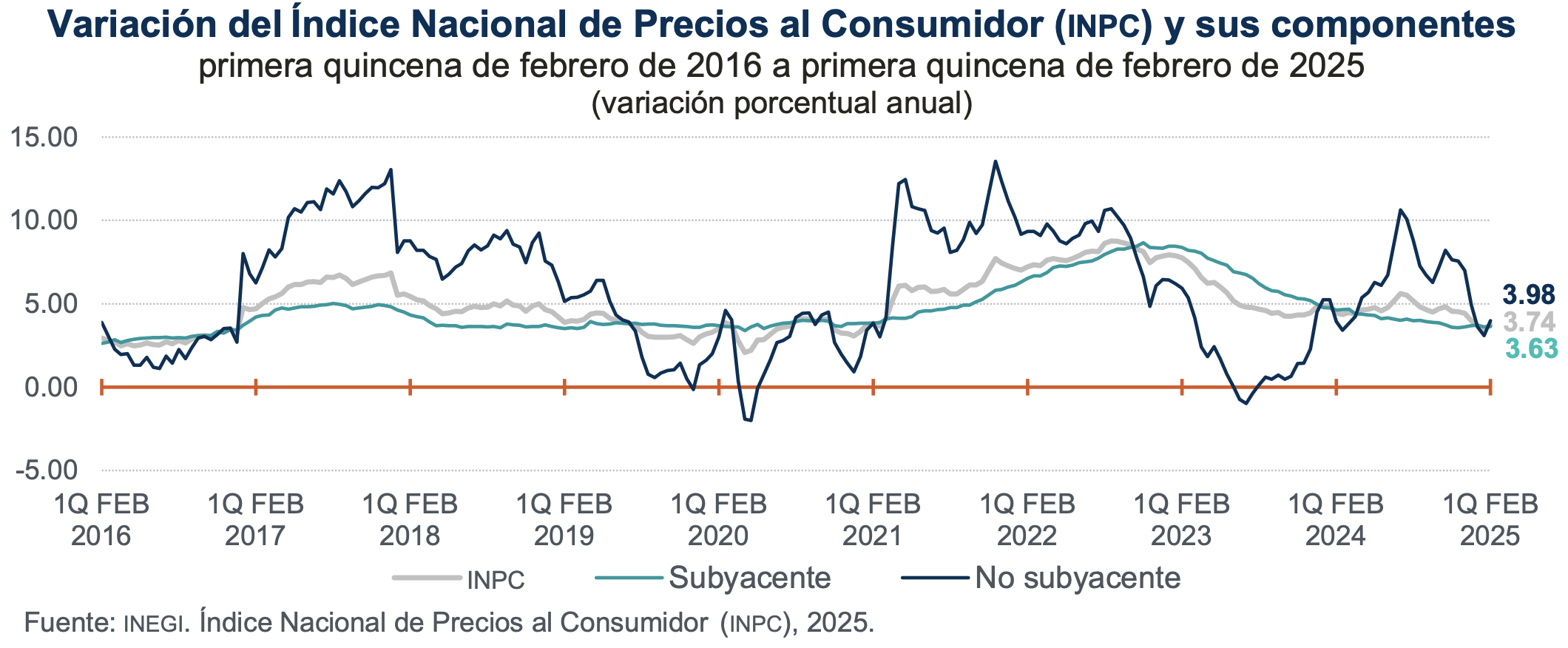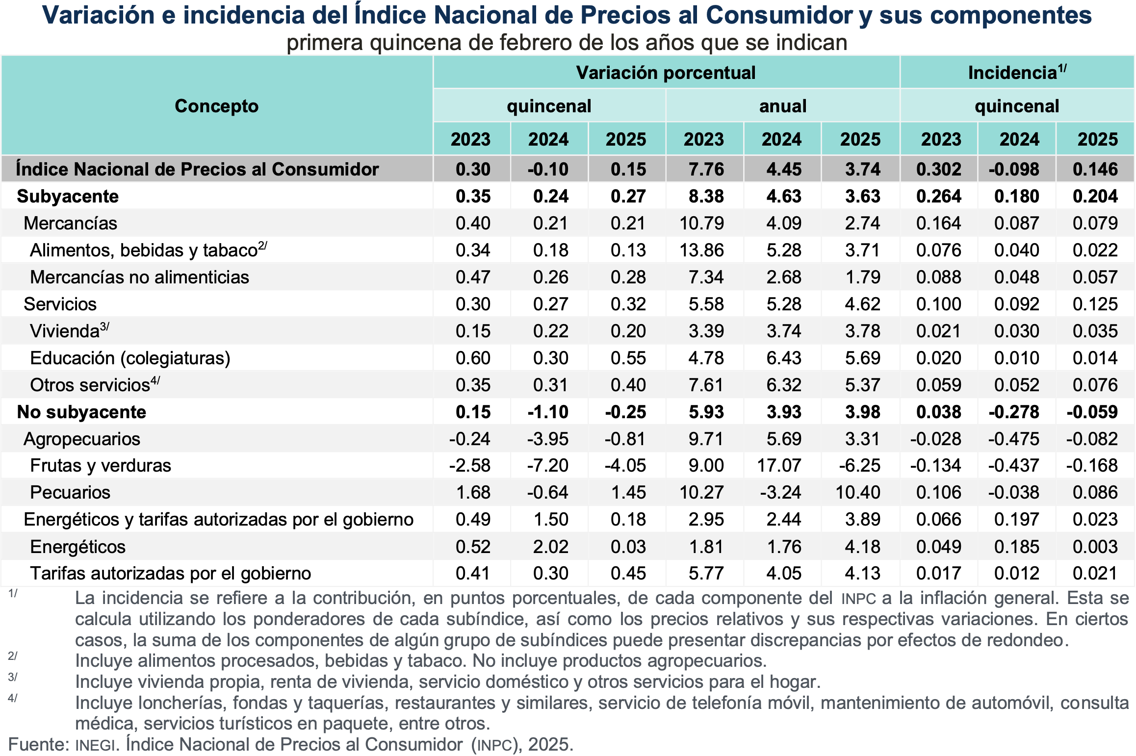 En la primera quincena de febrero de 2025, el Índice Nacional de Precios al Consumidor (INPC) registró un aumento 0.15 % respecto a la quincena anterior. Con este resultado, la inflación general anual se ubicó en 3.74 por ciento. En el mismo periodo de 2024, la inflación quincenal fue de -0.10 % y la anual, de 4.45 por ciento.