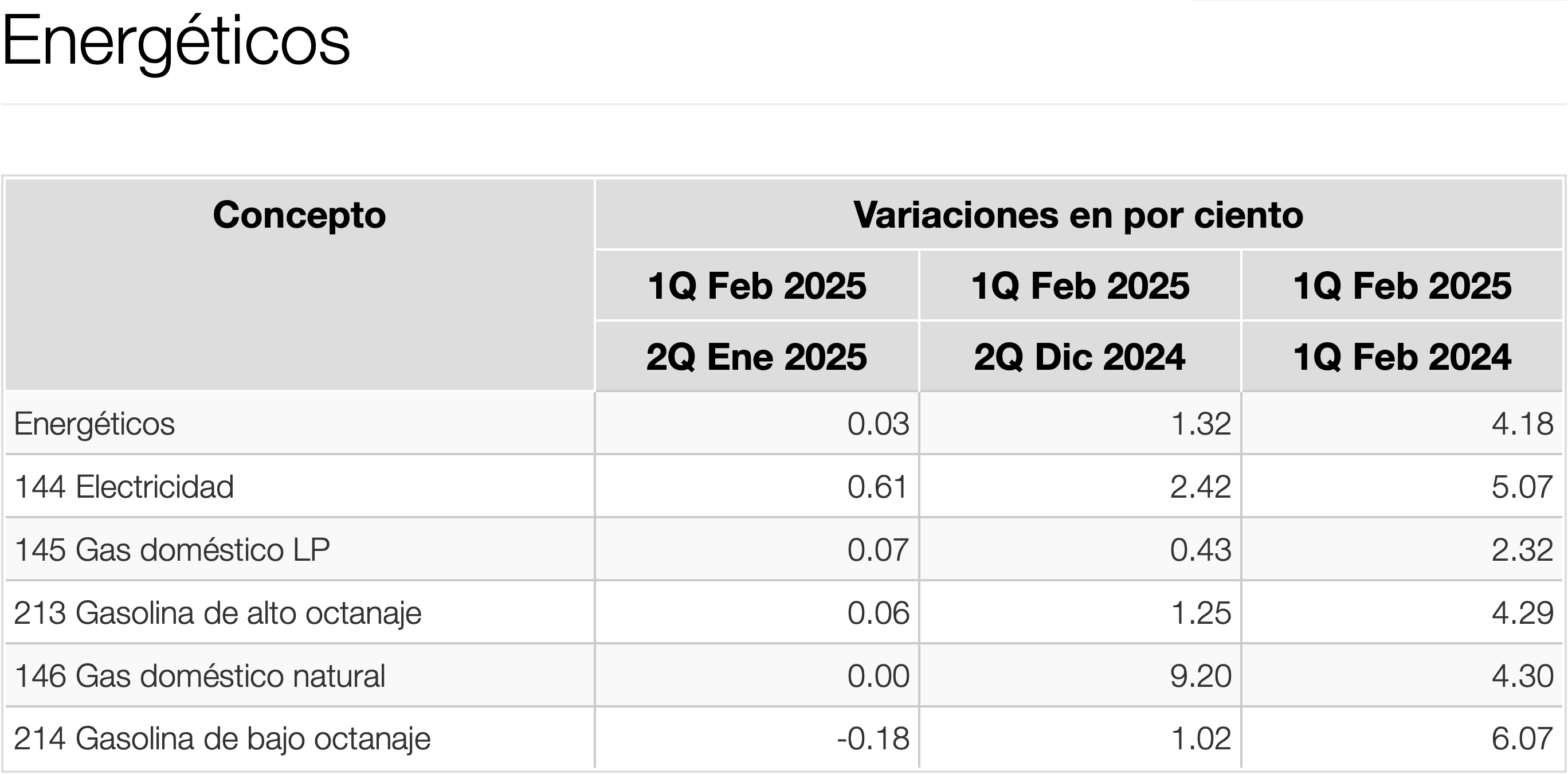 En los primeros quince días de febrero, los precios de las tarifas y servicios de los energéticos redujeron su presión a la inflación, en promedio energéticos subieron 0.03%. Lo que más subió fue la electricidad con 0.61%, mientras que la gasolina de bajo octanaje bajó -0.18%.