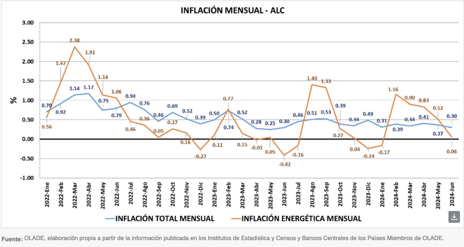 La inflación energética anual de América Latina y el Caribe, en junio de 2024 (respecto a junio de 2023) fue de 2.29%. Esta tasa es inferior a la inflación total (4.33%). Cabe notar que desde octubre de 2022 los precios del sector energía en la región siguen estando por debajo de los precios de la economía regional en su conjunto.