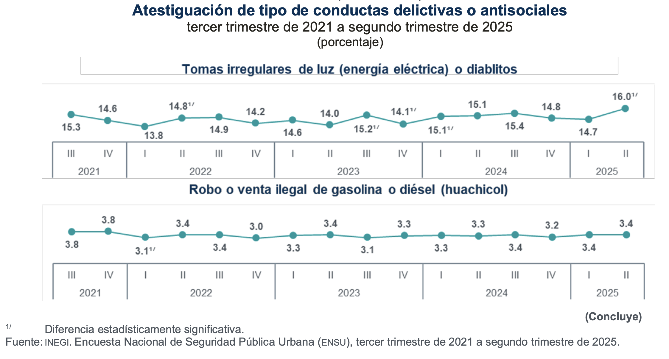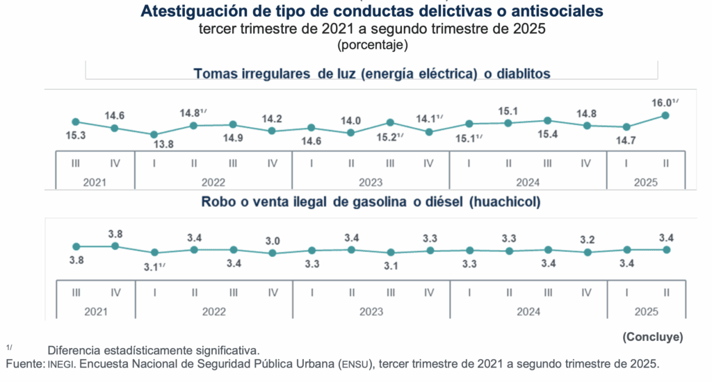 De la población que mencionó haber visto o escuchado conductas delictivas o antisociales en los alrededores de su vivienda durante el segundo trimestre de 2025, las tomas irregulares de luz (diablitos) alcanzan 16%, el nivel más alto en los primeros meses de gobierno de Claudia Sheinbaum y coincide con el nivel más alto del sexenio pasado.