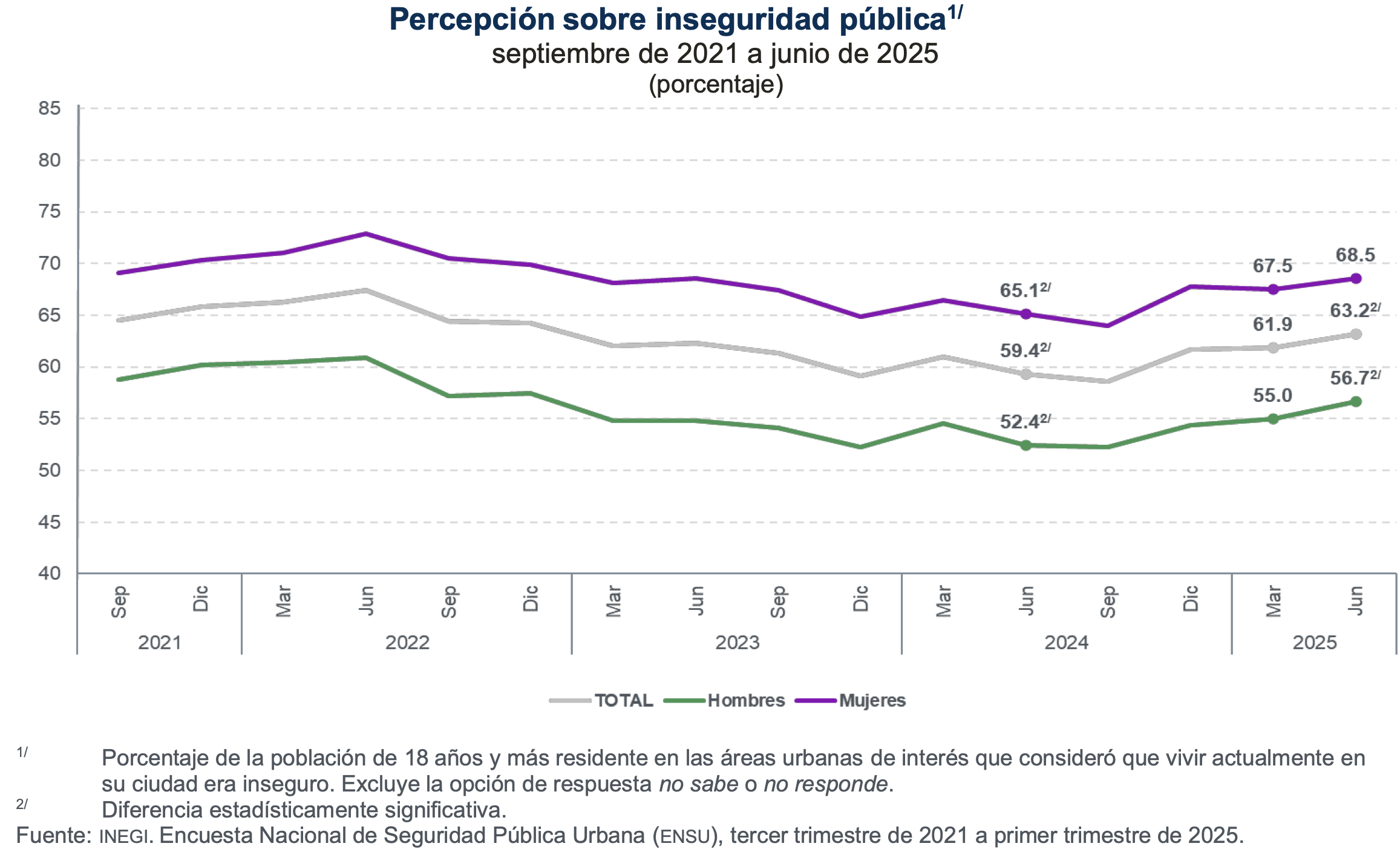 En el reporte a medio año de 2025, en esta edición, 16 áreas urbanas de interés presentaron cambios estadísticamente significativos frente a marzo de 2025: 6 con reducciones y 10 con incrementos. En junio de 2025, 68.5 % de las mujeres y 56.7 % de los hombres consideraron que vivir en su ciudad era inseguro.