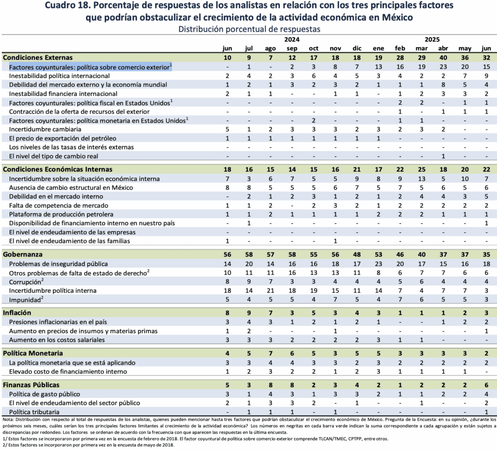 La persistente inseguridad, además del temor y el miedo que afecta a las personas, es la principal causa que podría obstaculizar la actividad económica en México. De acuerdo con la Encuesta sobre las Expectativas de los Especialistas en Economía del Sector Privado que realiza el Banco de México, de los tres principales factores que podrían obstaculizar el crecimiento de la actividad económica en México, la inseguridad es primer lugar con el 18%, le siguen las políticas de comercio exterior, con el 15%. Este último la política agresiva de aranceles de Trump.