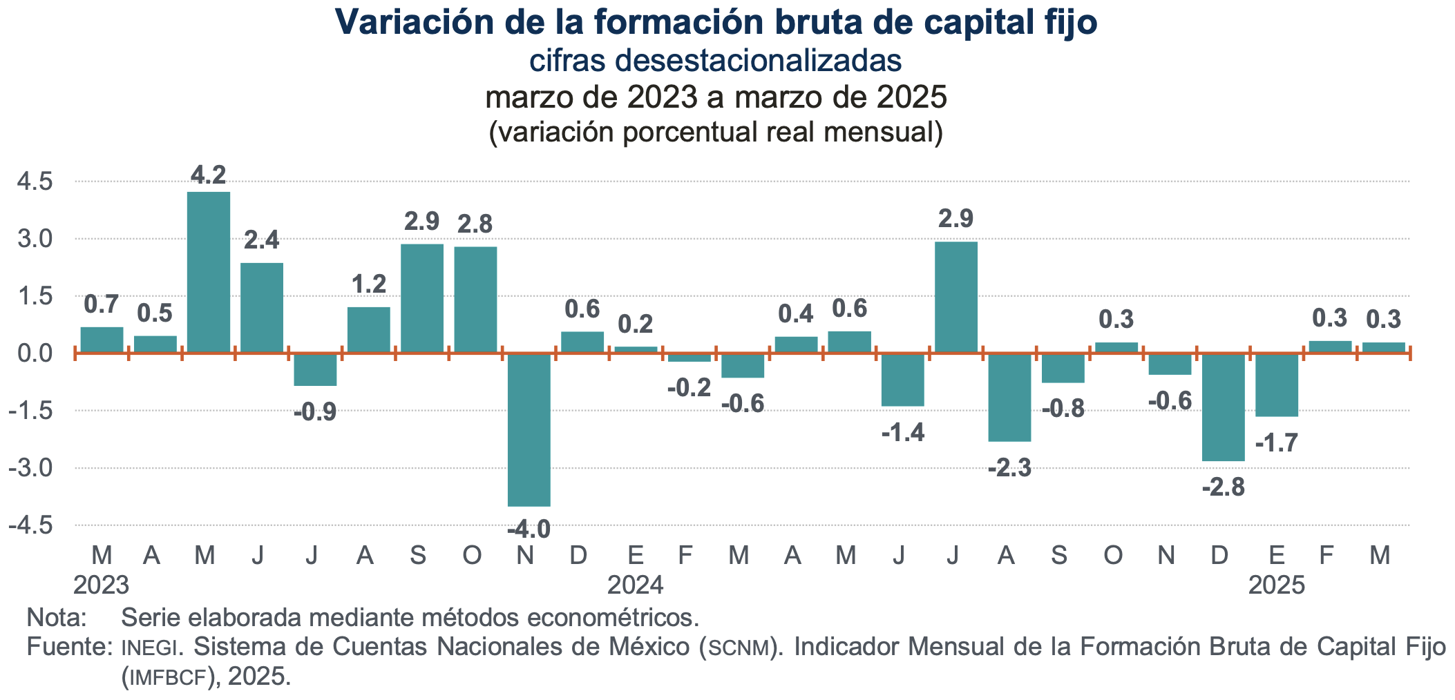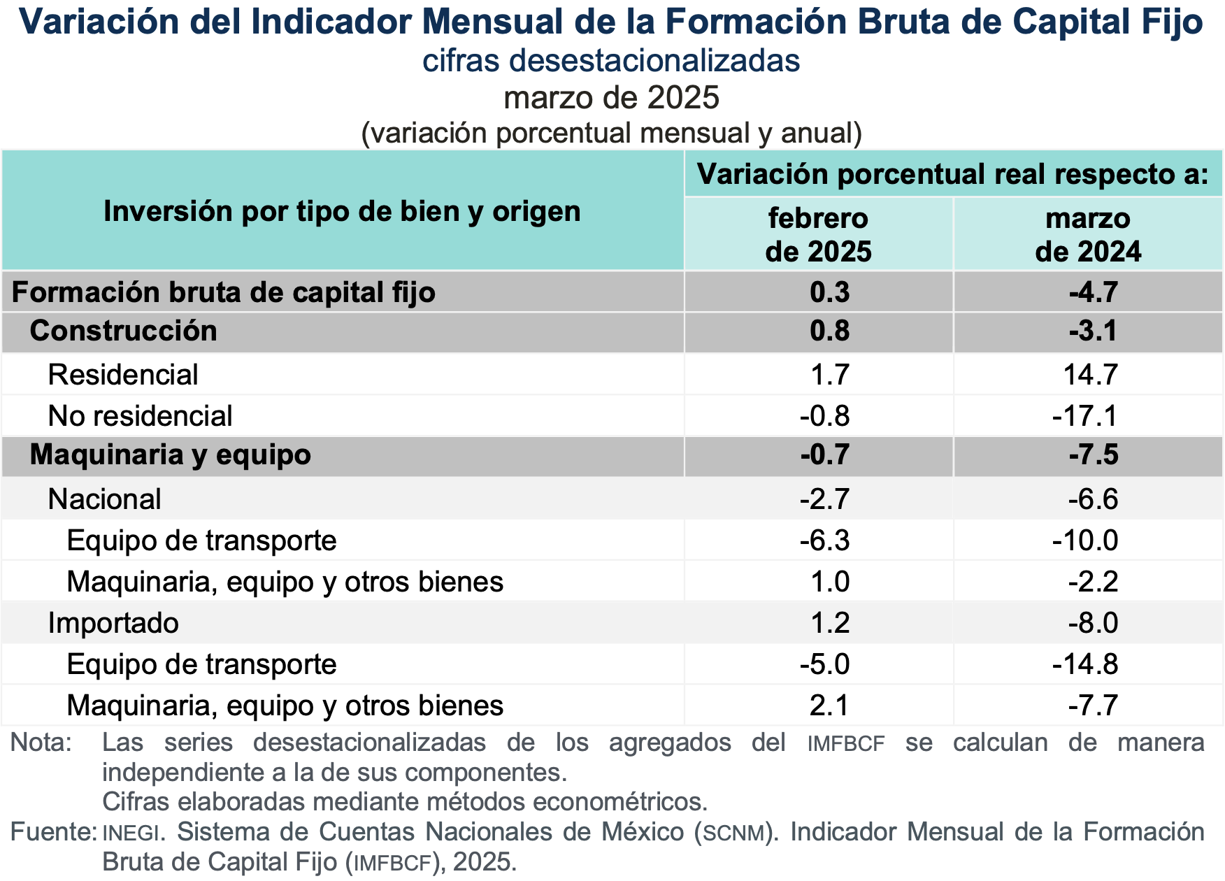 En marzo de 2025 y con cifras desestacionalizadas, la formación bruta de capital fijo aumentó 0.3 % respecto al mes previo, en términos reales. A tasa anual, descendió 4.7 por ciento, informó el Instituto Nacional de Estadística y Geografía (Inegi).