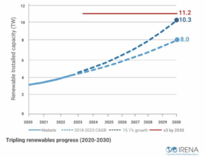 Si se mantiene el mismo ritmo de crecimiento anual, el mundo solo alcanzará 10,3 TW de capacidad renovable, lo que representa una diferencia de 0.9 TW con el objetivo. Alcanzar el objetivo para 2030 requeriría una expansión aún más rápida de la capacidad renovable, a un 16.6 % anual, en menos de los cinco años restantes.
