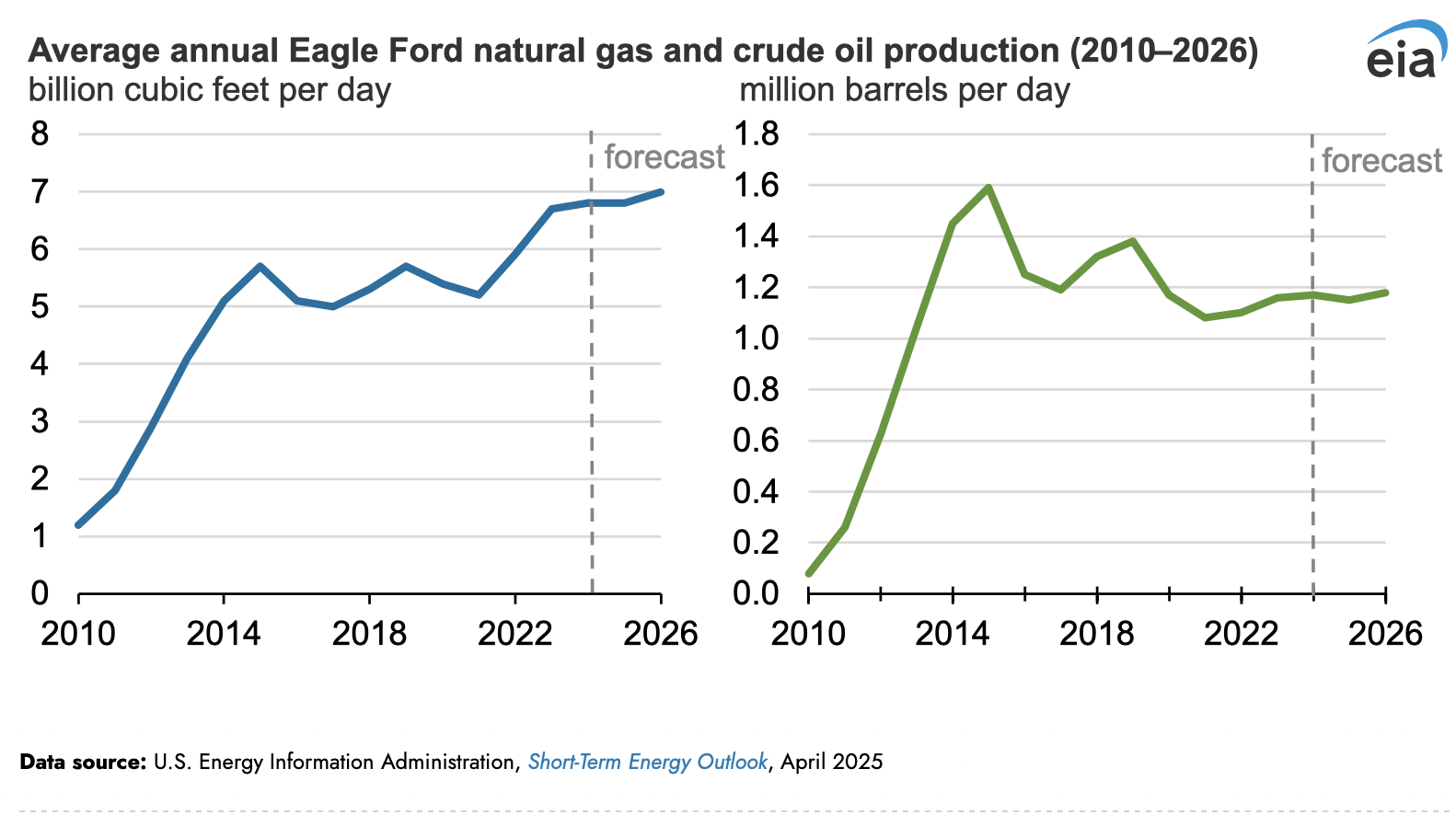En la Perspectiva Energética a Corto Plazo de abril de la Administración de Información Energética (EIA), se pronostica que la producción anual de gas natural de la región de Eagle Ford de EE.UU. en el suroeste de Texas crecerá de 6,800 millones de pies cúbicos por día (Bcf/d) en 2024 a 7.0 Bcf/d en 2026. El aumento en la producción de gas natural se produce a medida que aumentan los precios del gas natural y crece la demanda de exportaciones de gas natural licuado. La producción de petróleo en el Eagle Ford, por otro lado, ha rondado los 1.1 millones de barriles por día (b/d) desde 2020, y se pronostica que se mantendrá más o menos igual hasta 2026.
