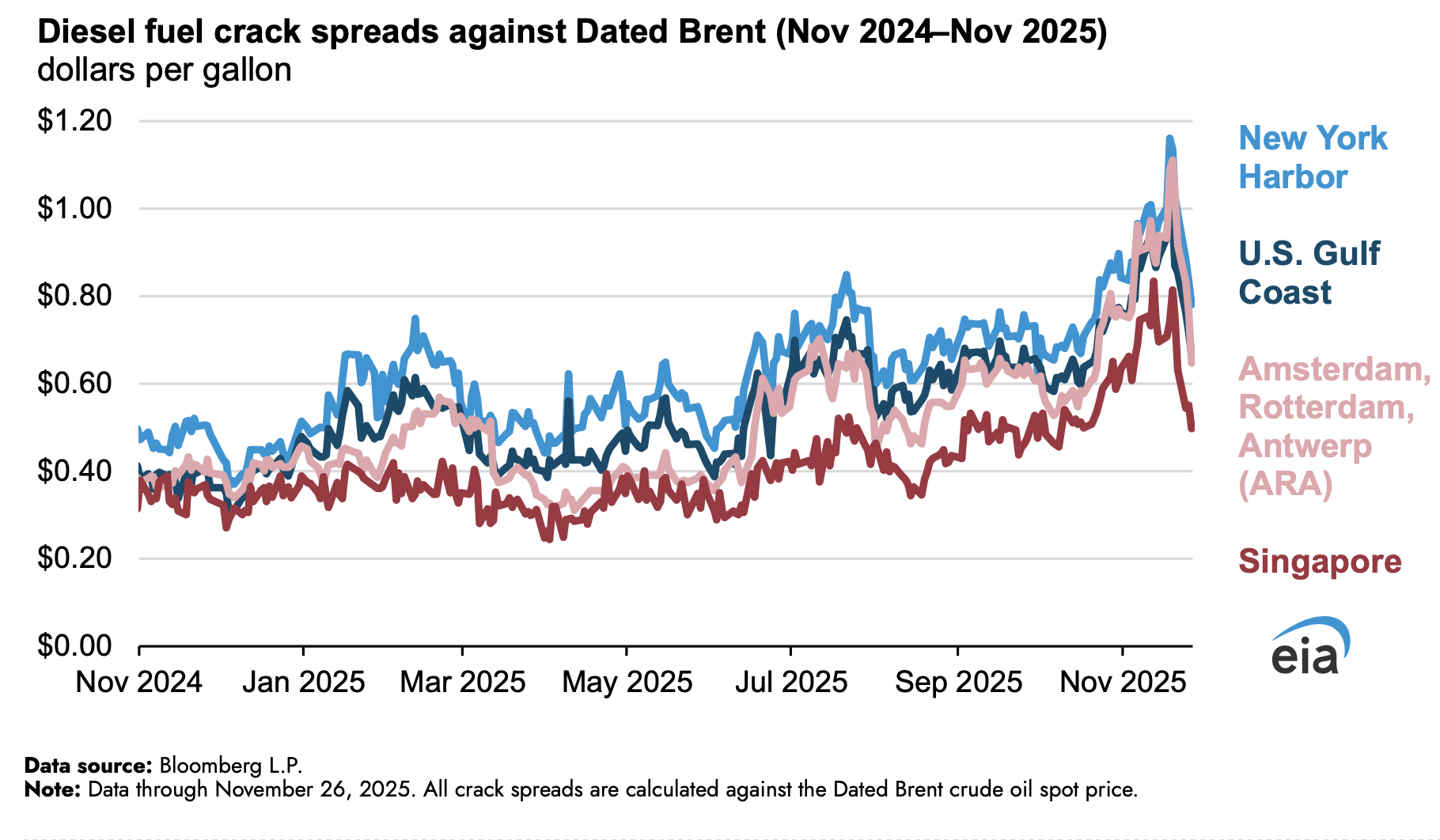 Las extensiones de crack indican la rentabilidad de refinar el petróleo crudo en ciertos productos. Se calculan restando el precio de mercado al contado de un galón de petróleo crudo del precio de un galón de producto refinado. Las propagaciones de grietas para el combustible diesel aumentaron bruscamente desde mediados de octubre hasta mediados de noviembre, con diferenciales en el puerto de Nueva York, EE. UU, de la Costa del Golfo y el centro de envío de ARA se elevan por encima de 1 dólar por galón por primera vez en más de un año.