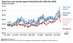 Los márgenes mundiales de las refinerías para el diésel se han ampliado desde finales de octubre y han aumentado a su nivel más alto de todo el año, tras las interrupciones de las refinerías en Rusia y en Oriente Medio y las nuevas sanciones al petróleo crudo de Rusia, lo que ha llevado a una producción limitada de las refinerías y a una disminución del suministro mundial de diésel. El impacto fue más pronunciado en la cuenca atlántica, contribuyendo a precios más altos en el centro de envío de Ámsterdam, Rotterdam, Amberes (ARA), un punto de referencia clave para los precios europeos, así como en el puerto de Nueva York y los Estados Unidos de la  Costa del Golfo. Los precios globales más altos también afectaron a los precios en los Estados Unidos porque las refinerías estadounidenses pueden venderse tanto en mercados nacionales como internacionales, revela un análisis de Administración de Información Energética de Estados Unidos.
