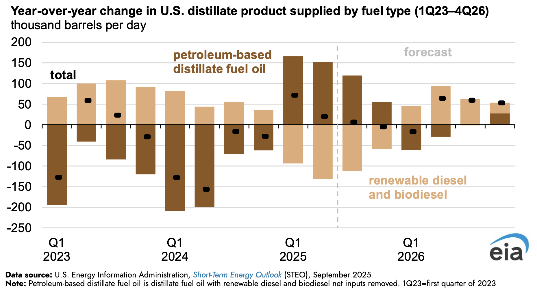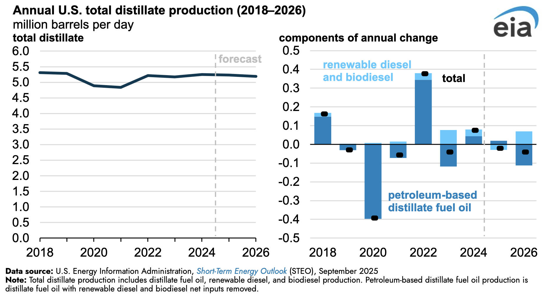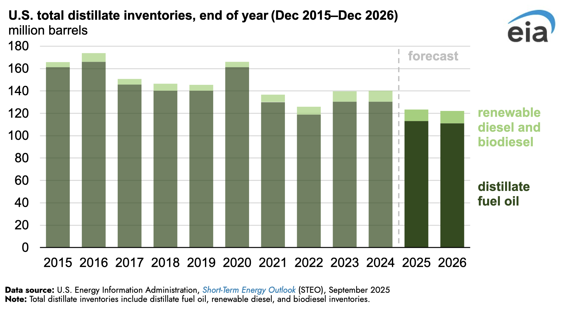 En las perspectiva energética a corto plazo de septiembre de la Administración de Información Energética (EIA, por sus siglas en inglés) pronostica que los inventarios totales de destilados de EE. UU. terminarán en 2025 y 2026 a niveles más bajos que en años anteriores debido a importantes reducciones de inventario en 2025, por la fuerte demanda de exportación y disminuciones de la producción nacional derivadas del cierre de refinerías. En las semanas posteriores a la publicación de este pronóstico, los inventarios de destilados de EE. UU. han aumentado sustancialmente, pero siguen siendo relativamente bajos. El combustible destilado incluye tanto el combustible diesel utilizado en los vehículos como el aceite de calefacción para el hogar. Los inventarios más bajos de destilados elevan el riesgo de precios más altos y volatilidad de precios por interrupciones en el suministro, especialmente durante períodos de alta demanda como la cosecha de otoño y la temporada de calefacción de invierno.