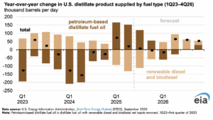 Se espera que una caída en la primera mitad del año en el consumo de biocombustibles sea una desviación a corto plazo de la tendencia a largo plazo de que los biocombustibles aumenten como parte del consumo de destilados. El consumo de diésel renovable y biodiésel se recuperará parcialmente en la segunda mitad de 2025 para cumplir con los mandatos de producción existentes y futuros bajo la Norma de Combustibles Renovables (RFS). Por lo pronto, se espera un aumento en la producción de diésel y biodiésel renovable y compense parcialmente el aumento en el consumo total de combustible destilado que se pronostica en 2026, lo que resultará en inventarios de combustible destilado esencialmente planos entre diciembre de 2025 y diciembre de 2026.
