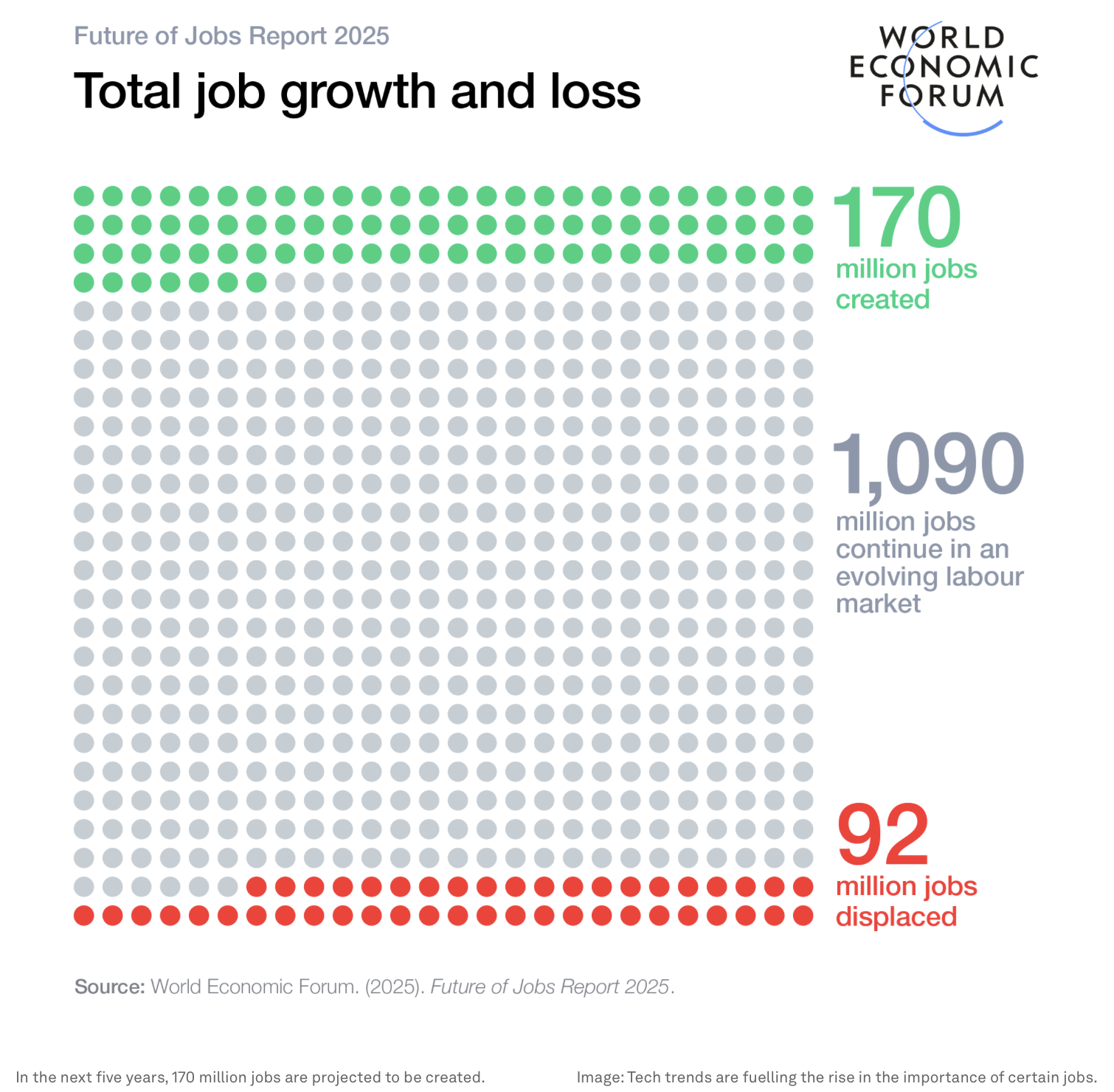 Los empleos creados equivalen al 14 % del empleo actual. Además, 92 millones de roles serán desplazados por estas mismas tendencias. Esto significa que habrá un aumento neto del empleo de 78 millones de puestos de trabajo.