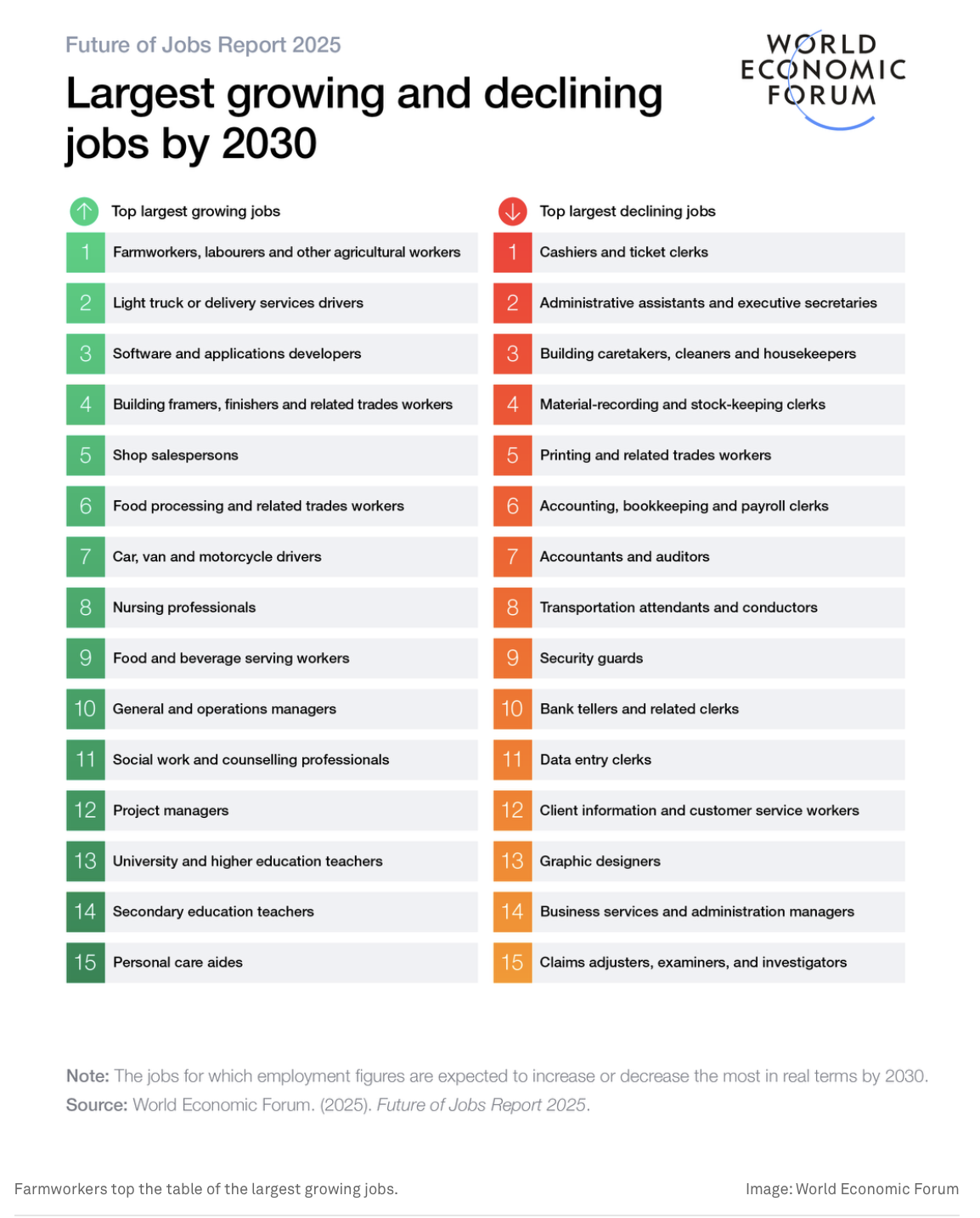 Pero, ¿qué pasa con los números absolutos? Combinando estimaciones de empresas encuestadas con datos de empleo de la Organización Internacional del Trabajo, el informe enumera las 15 profesiones que verán el mayor crecimiento y disminución neto.