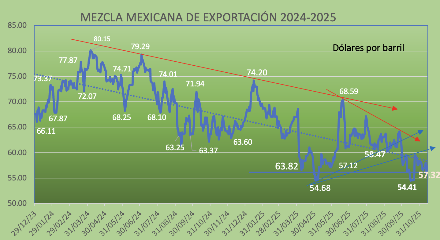 Al cierre del viernes, el precio de la Mezcla Mexicana de Exportación (MME), cerró en 57.32 dólares el barril, para sumar dos semanas por debajo de la estimación revisada de la Hacienda para el 2025.