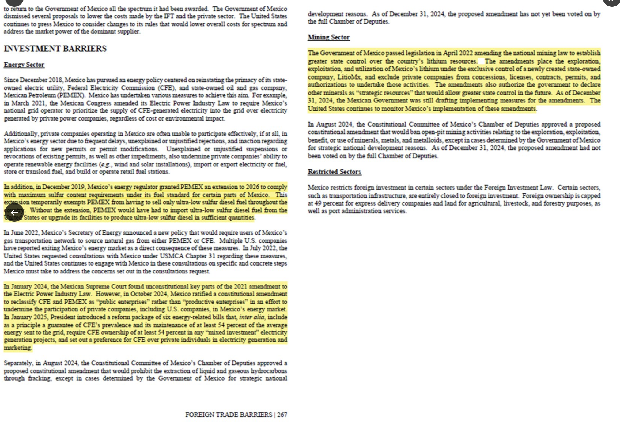 Las revisiones que establece revisiones en las barreras a la inversión, en las que destacan tres temas: 1) La prórroga exime temporalmente a PEMEX de tener que vender únicamente diésel ultrabajo en azufre en todo el país; 2) Ley de la Industria Eléctrica. México ratificó una reforma constitucional para reclasificar a la CFE y a PEMEX como «empresas públicas» en lugar de «empresas productivas», con el fin de socavar la participación de empresas privadas, incluidas las estadounidenses, en el mercado energético mexicano, y 3).- El Gobierno de México aprobó en abril de 2022 una ley que modifica la Ley Nacional de Minería para establecer un mayor control estatal sobre los recursos de litio del país.