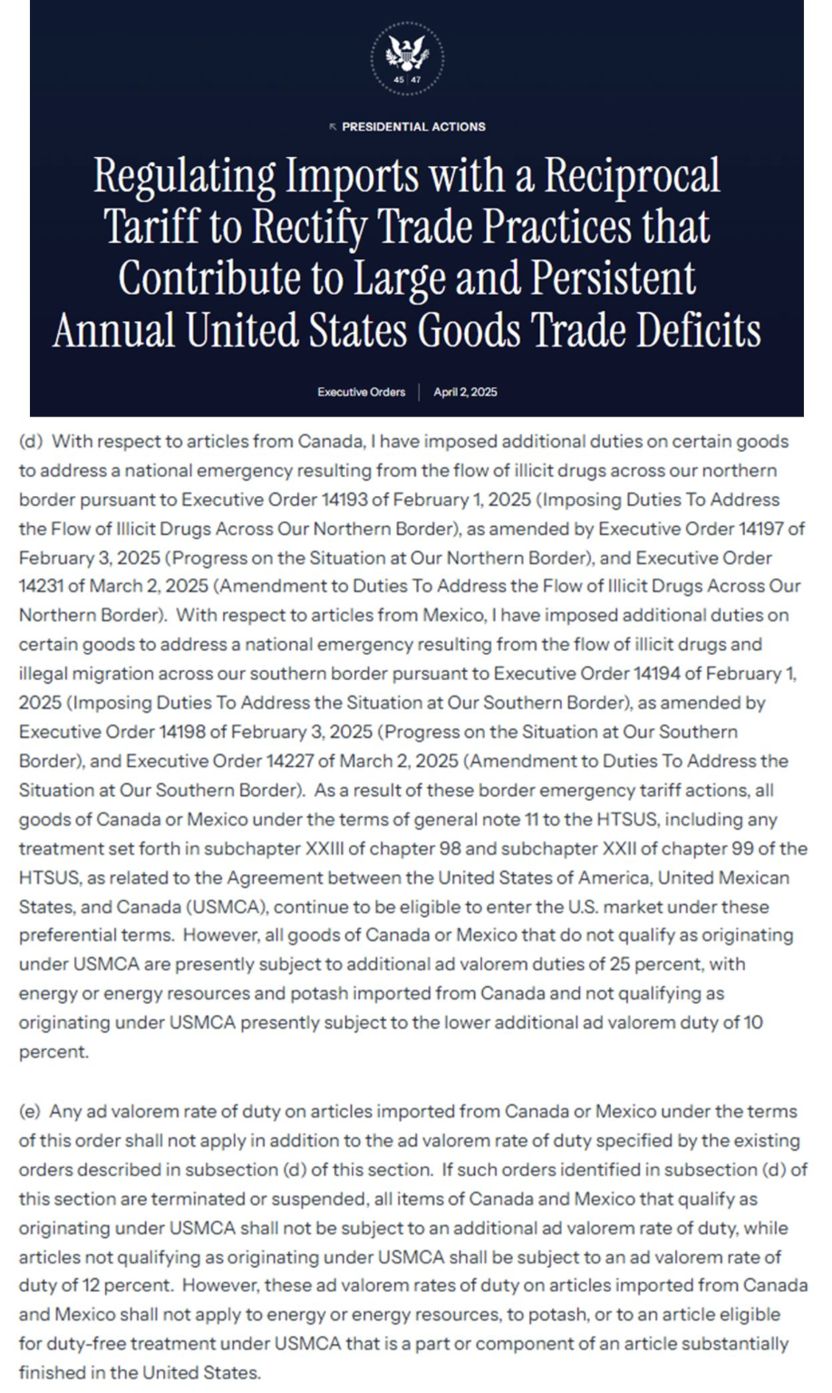 (d) With respect to articles from Canada, I have imposed additional duties on certain goods to address a national emergency resulting from the flow of illicit drugs across our northern border pursuant to Executive Order 14193 of February 1, 2025 (Imposing Duties To Address the Flow of Illicit Drugs Across Our Northern Border), as amended by Executive Order 14197 of February 3, 2025 (Progress on the Situation at Our Northern Border), and Executive Order 14231 of March 2, 2025 (Amendment to Duties To Address the Flow of Illicit Drugs Across Our Northern Border). With respect to articles from Mexico, I have imposed additional duties on certain goods to address a national emergency resulting from the flow of illicit drugs and illegal migration across our southern border pursuant to Executive Order 14194 of February 1, 2025 (Imposing Duties To Address the Situation at Our Southern Border), as amended by Executive Order 14198 of February 3, 2025 (Progress on the Situation at Our Southern Border), and Executive Order 14227 of March 2, 2025 (Amendment to Duties To Address the Situation at Our Southern Border). As a result of these border emergency tariff actions, all goods of Canada or Mexico under the terms of general note 11 to the HTSUS, including any treatment set forth in subchapter XXIII of chapter 98 and subchapter XXII of chapter 99 of the HTSUS, as related to the Agreement between the United States of America, United Mexican States, and Canada (USMCA), continue to be eligible to enter the U.S. market under these preferential terms. However, all goods of Canada or Mexico that do not qualify as originating under USMCA are presently subject to additional ad valorem duties of 25 percent, with energy or energy resources and potash imported from Canada and not qualifying as originating under USMCA presently subject to the lower additional ad valorem duty of 10 percent.