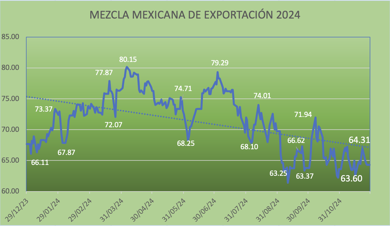 El alza de noviembre no alcanzó a revertir las pérdidas en el 2024, el crudo mexicano registra baja -4.94% con un promedio de 71.25 dólares, un máximo de 80.15 dólares y un mínimo de 61.39 dólares.
