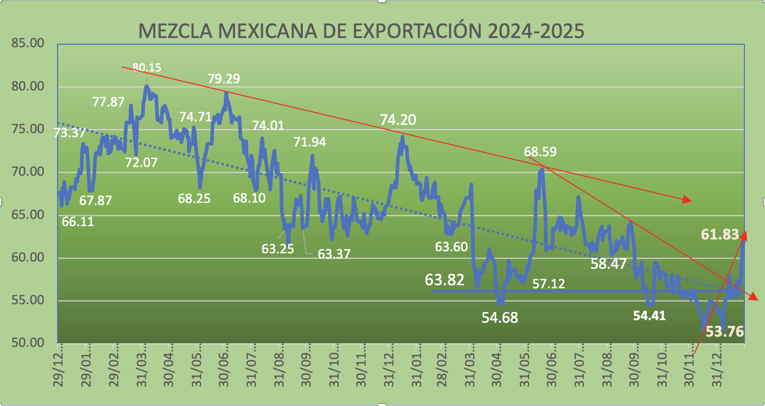 Al cierre de enero de 2026, el precio de la Mezcla Mexicana de Exportación se ubica en 61.83 dólares el barril, con una ganancia en enero de 15.31%. En el mes, el crudo mexicana reportó un promedio de 56.17 dólares, un máximo en 61.93 dólares y un mínimo de 51.64 dólares.
