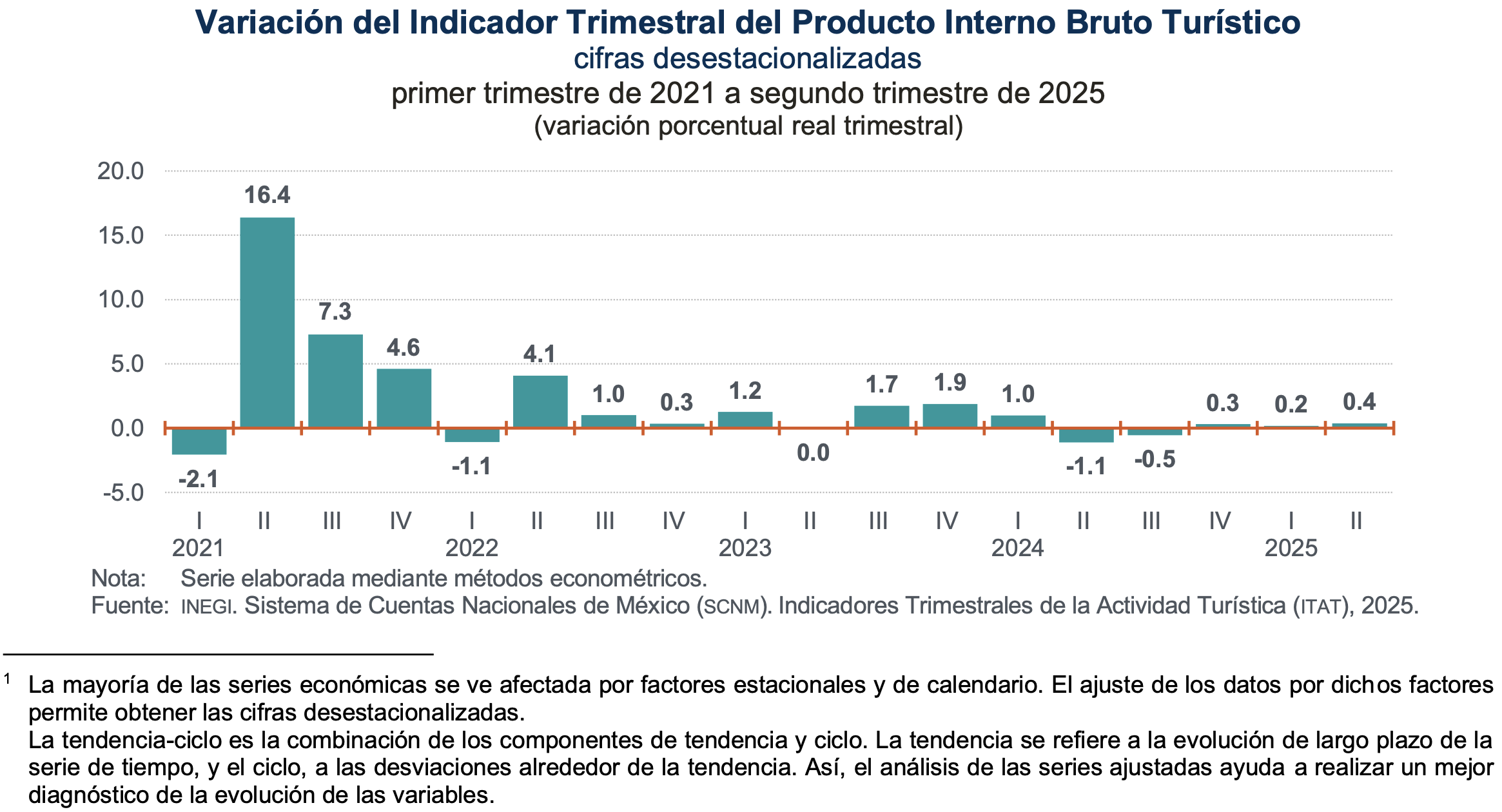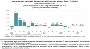 En el segundo trimestre de 2025 y con cifras desestacionalizadas, el Indicador Trimestral del Producto Interno Bruto Turístico (ITPIBT) incrementó 0.4 % respecto al trimestre previo, en términos reales. A tasa anual ascendió 0.3 por ciento, informó el Instituto Nacional de Estadística y Geografía (Inegi).