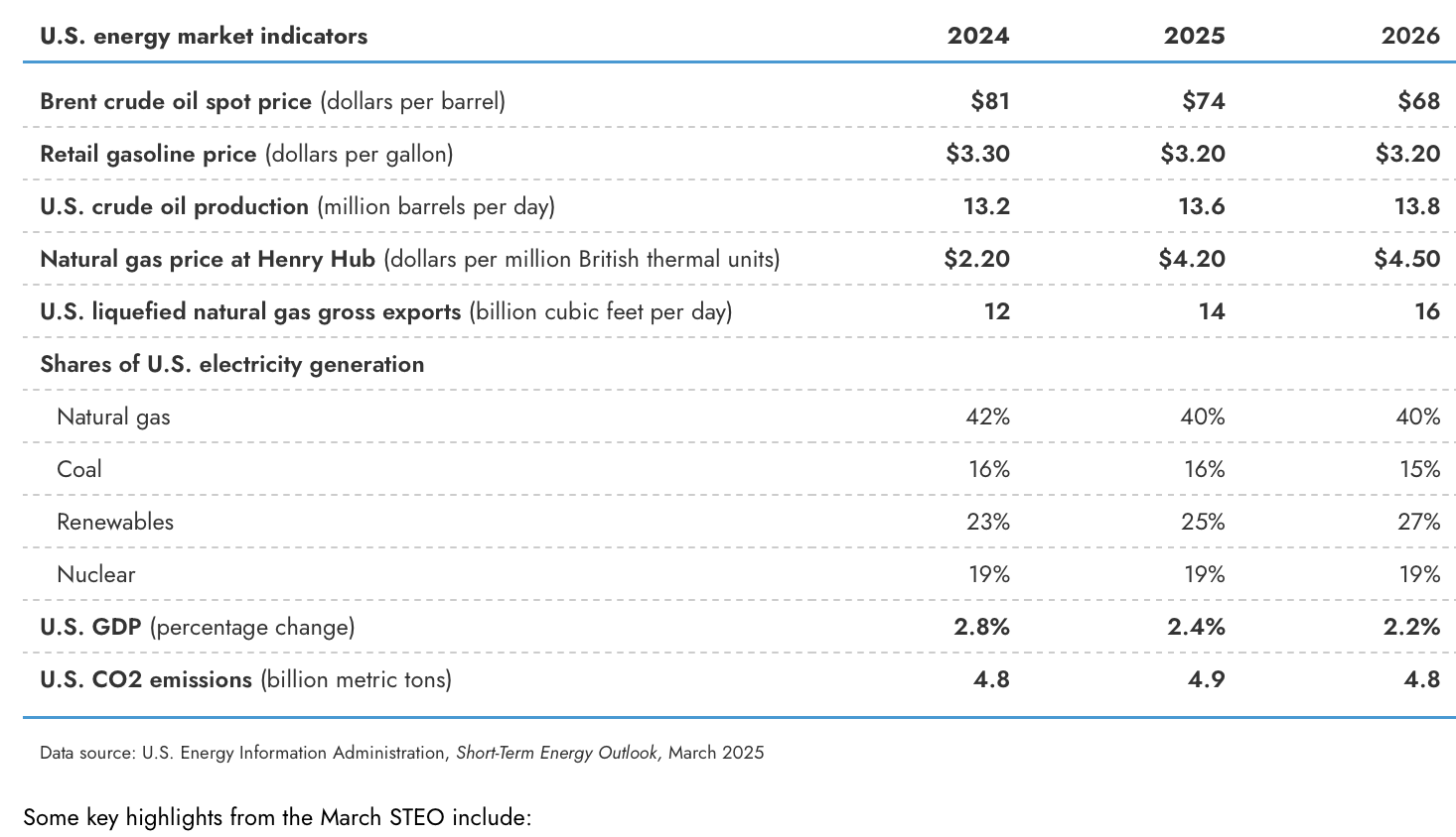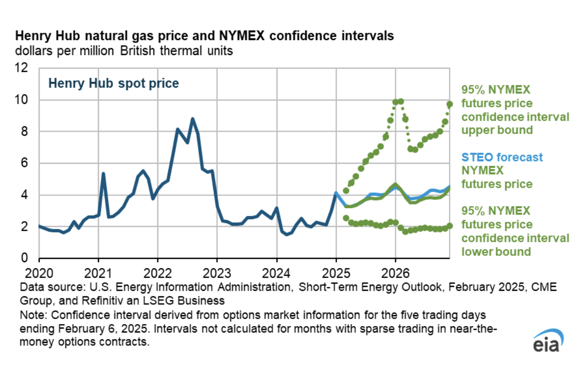 La Administración de Información Energética de Estados Unidos revisó al alza el pronóstico para el precio spot del gas natural Henry Hub de referencia promedio de EE. UU. para 2025 luego de un final frío en febrero, y el  pronóstico para el precio spot del petróleo crudo Brent, esperando que caiga a fines de 2025.