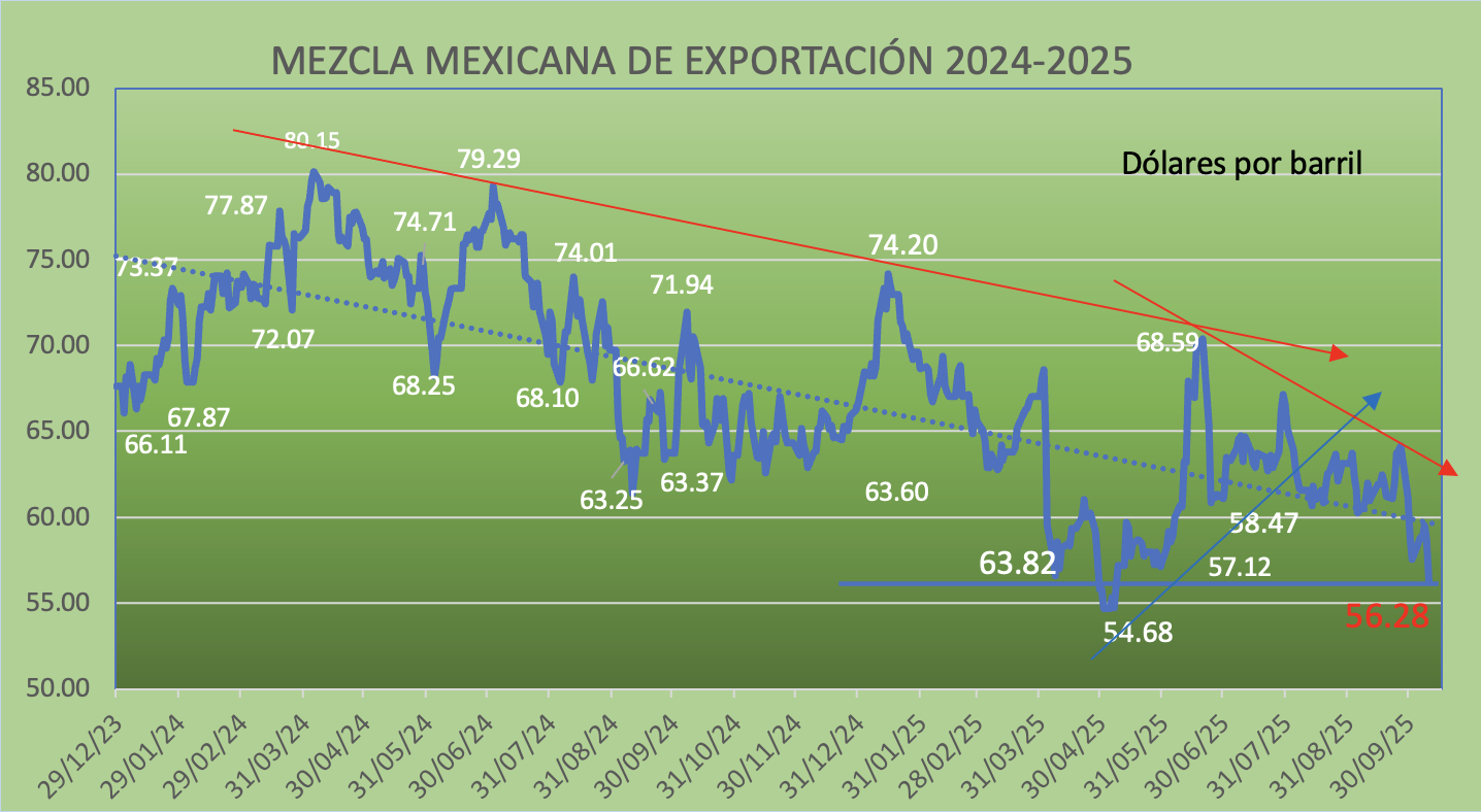 Al cierre del viernes, el precio de la Mezcla Mexicana de Exportación se ubicó en 56.28 dólares el barril, que lo coloca por debajo de la estimación de Hacienda para 2025 de 62 dólares, nivel revisado, pero también de la estimación inicial, que era de 57.80 dólares el barril.