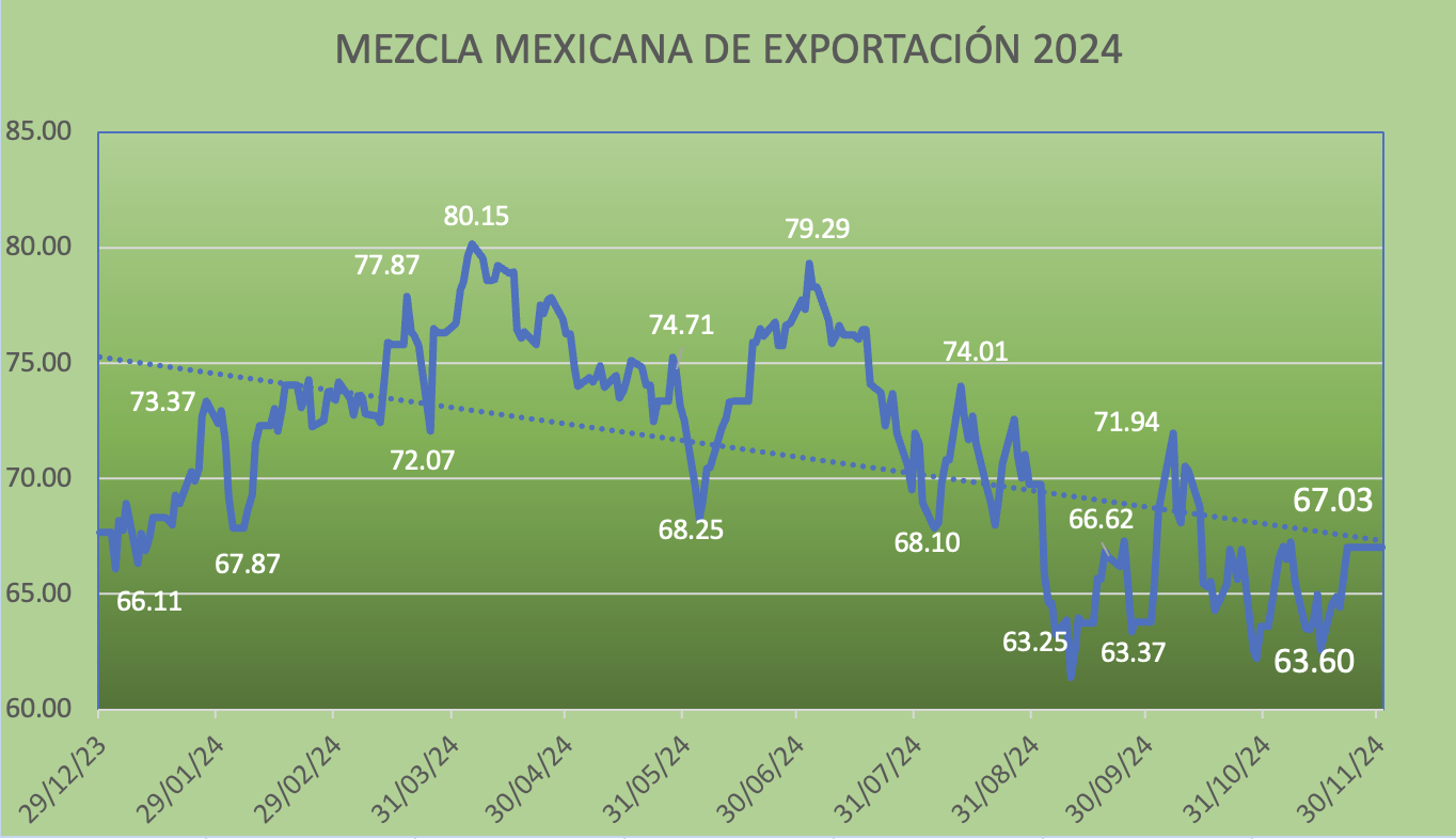 Al cierre del viernes, el precio de la Mezcla Mexicana de Exportación se ubicó en 67.03 dólares el barril, lo que significó un repunte semanal de 7.09%. En los últimos tres meses el indicador se mueve en un rengo de los 71 y 62 dólares.