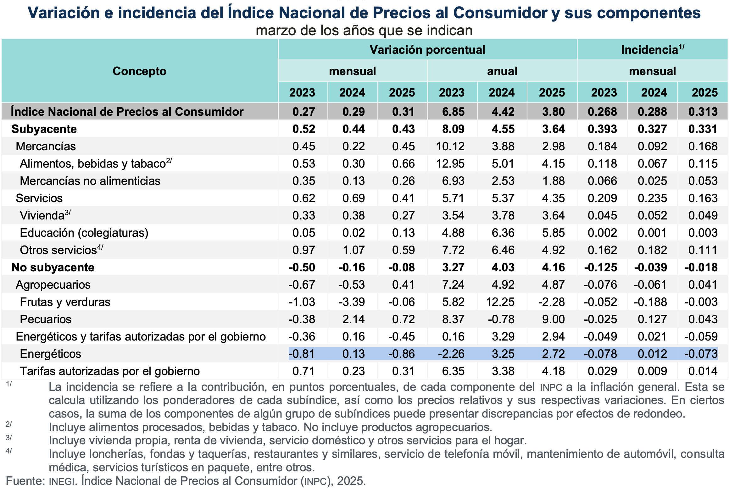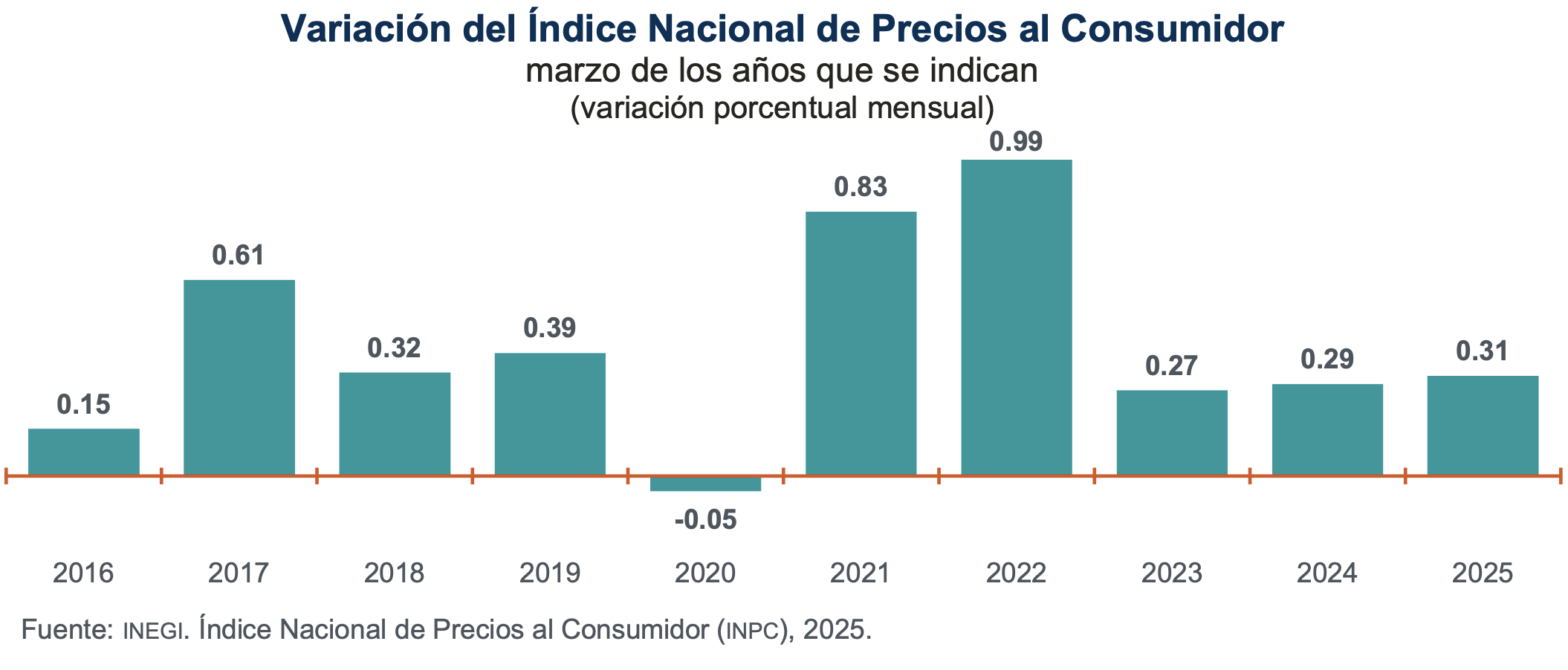 En marzo de 2025, el Indice Nacional de Precios al Consumidor (INPC) presentó un nivel de 139.161: aumentó 0.31 % respecto al mes anterior, el nivel más alto para un mismo periodo en tres años. Con este resultado, la inflación general anual se ubicó en 3.80 por ciento. En el mismo mes de 2024, la inflación mensual fue de 0.29 % y la anual, de 4.42 por ciento.