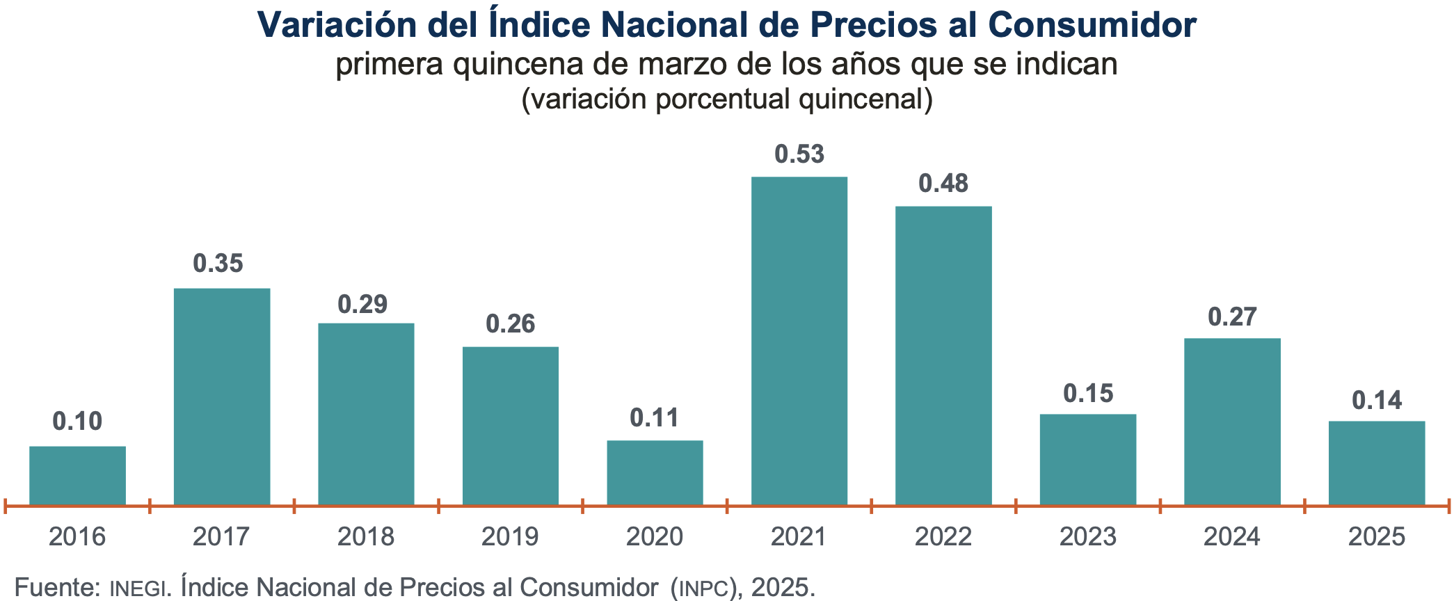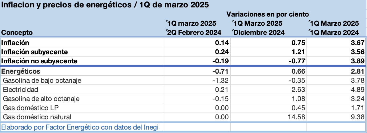 Durante la primera quincena de marzo de 2025, los precios de los energéticos reportan una baja de 0.71%, mientras que la inflación fue de 0.14%, el menor nivel en cinco años para un periodo igual.