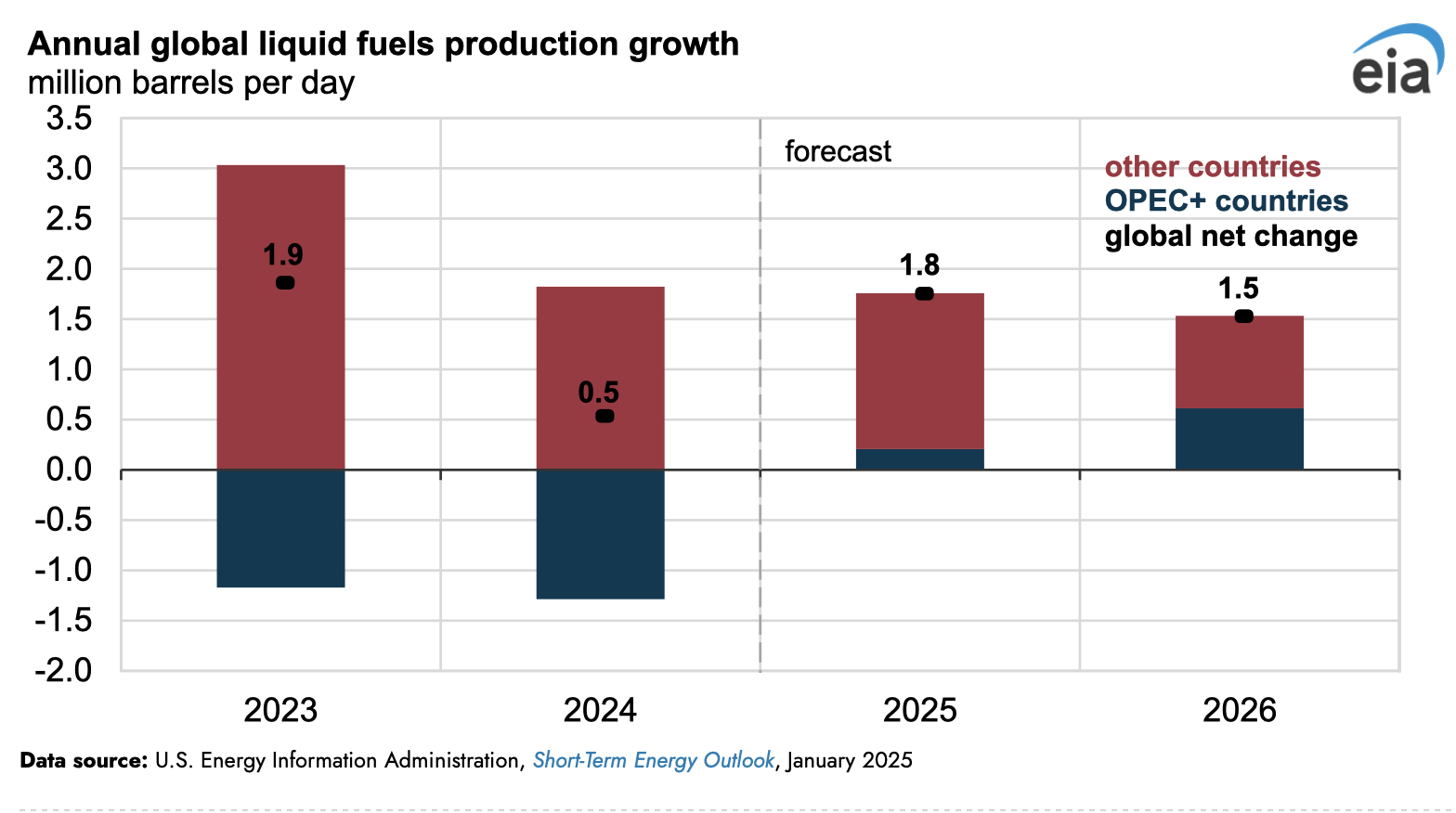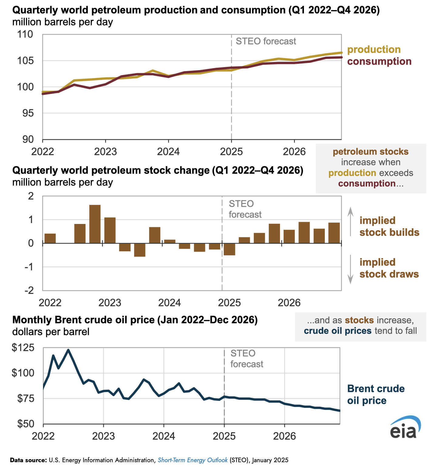 La Administración de Información Energética de Estados Unidos pronostica que los precios del petróleo crudo Brent de referencia caerán de un promedio de 81 dólares por barril (b) en 2024 a 74 mil millones de dólares en 2025 y 66 dólares en 2026, ya que el fuerte crecimiento global en la producción de petróleo y otros líquidos y el crecimiento más lento de la demanda ejercen presión a la baja sobre los precios y ayudan a compensar el aumento de los riesgos geopolíticos y la restricción voluntaria de la producción por parte de los miembros de la OPEP+. Este pronóstico se completó antes de que Estados Unidos emitiera sanciones adicionales dirigidas al sector petrolero de Rusia el 10 de enero, que tienen el potencial de reducir las exportaciones de petróleo de Rusia al mercado global.