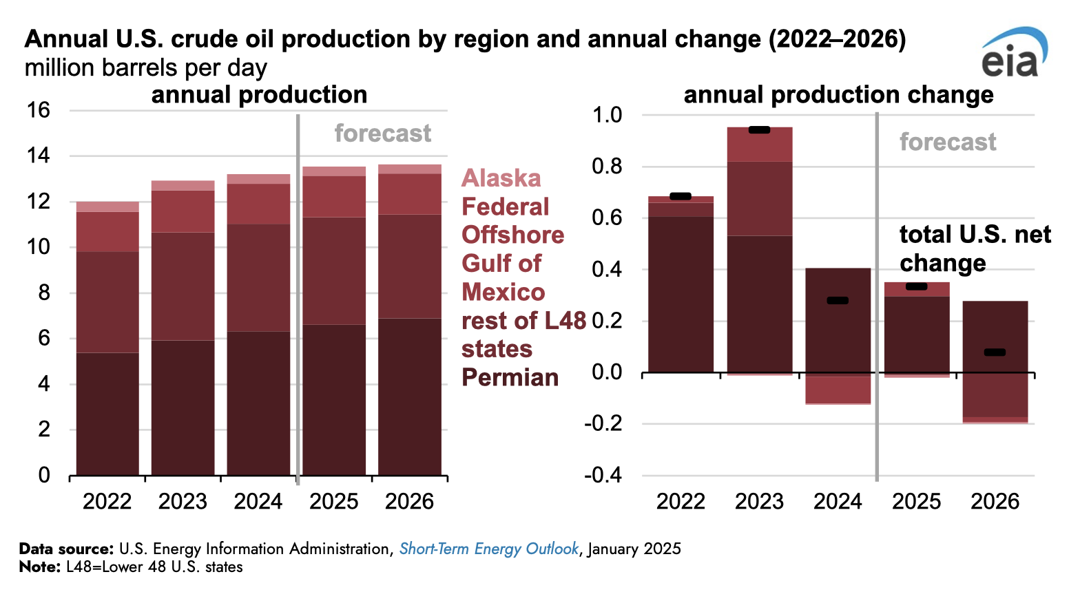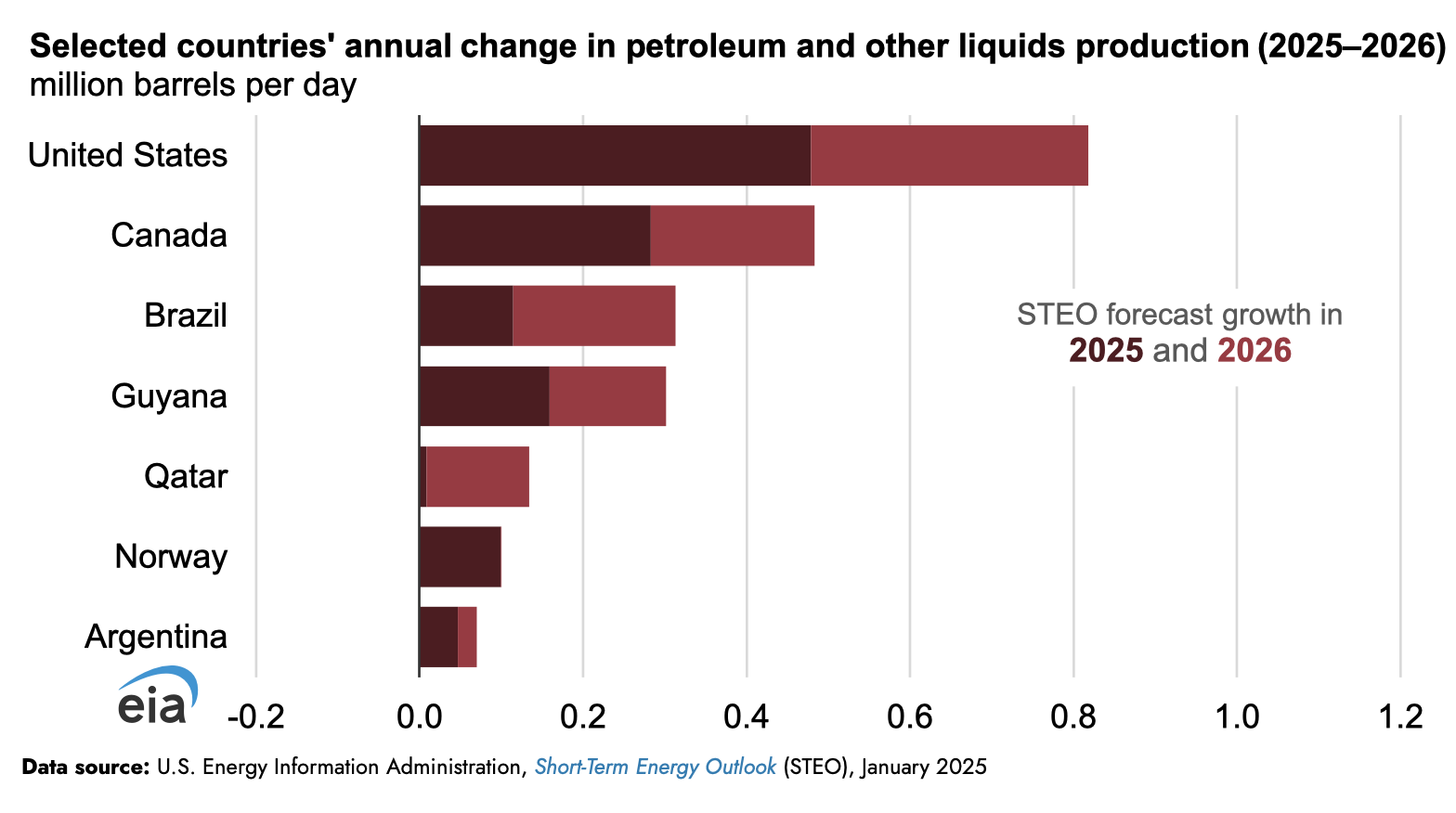 La producción de petróleo crudo de los Estados Unidos alcanzará un máximo de todos los tiempos en 2025, con un promedio de 13,5 millones de b/d, aumentando ligeramente a 13,6 millones de b/d en 2026. La incertidumbre en nuestro pronóstico de precios implica incertidumbre en nuestras perspectivas para la producción de petróleo crudo de los Estados Unidos.