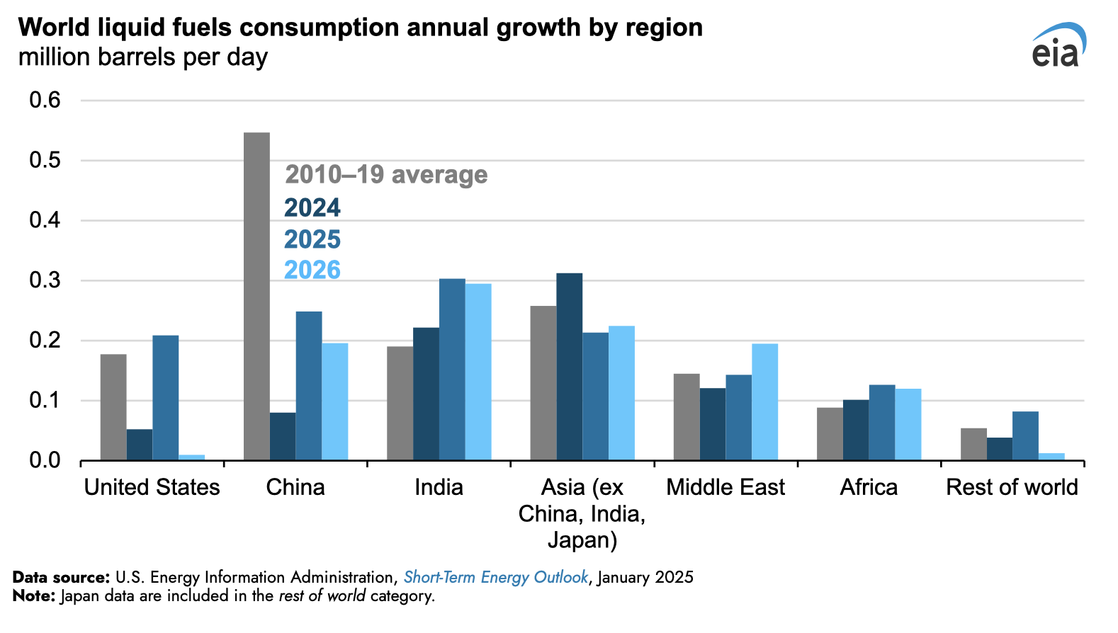 El año pasado fue el primer año desde la pandemia de COVID-19 en el que el crecimiento de la población, el crecimiento económico y el consumo de petróleo no se vieron afectados por las reducciones o la recuperación relacionadas con la pandemia. El consumo mundial de combustibles líquidos creció menos que en la década anterior a la pandemia (2010-19) y continuará creciendo más lentamente en 2025 y 2026. Liderados por la India, los países asiáticos (excluyendo China y Japón) y los mercados emergentes de Oriente Medio y África aumentarán el consumo mundial de combustibles líquidos en 1,3 millones de b/d en 2025 y 1,1 millones de b/d en 2026, menos que el promedio de 2010-19 de 1,5 millones de b/d.