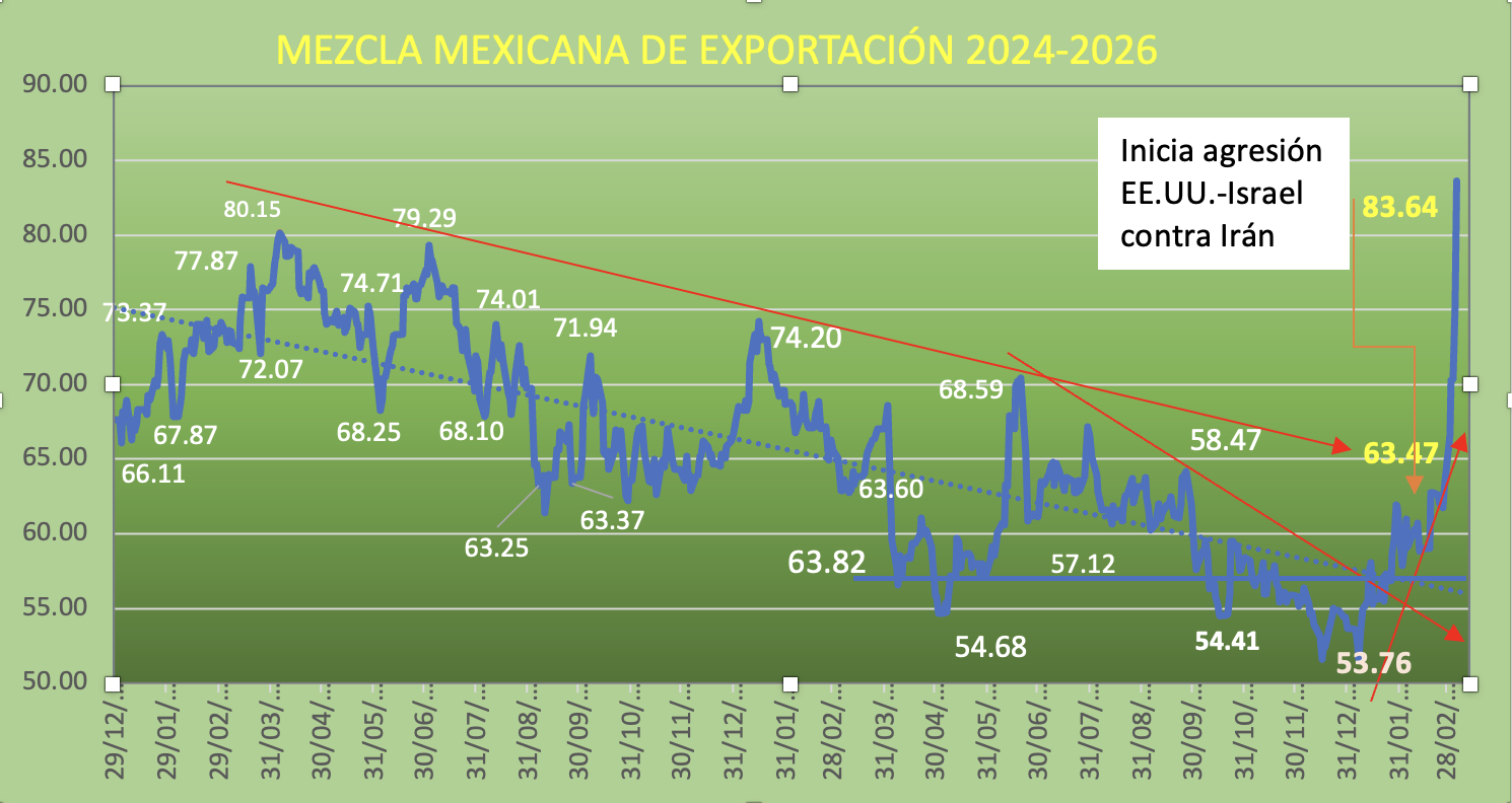 En México, la Mezcla Mexicana de Exportación (MME), alcanzó los 83.64 dólares con una ganancia semanal de 31.78%, pero si consideramos lo que va del 2026, la subida es de 55.99%.