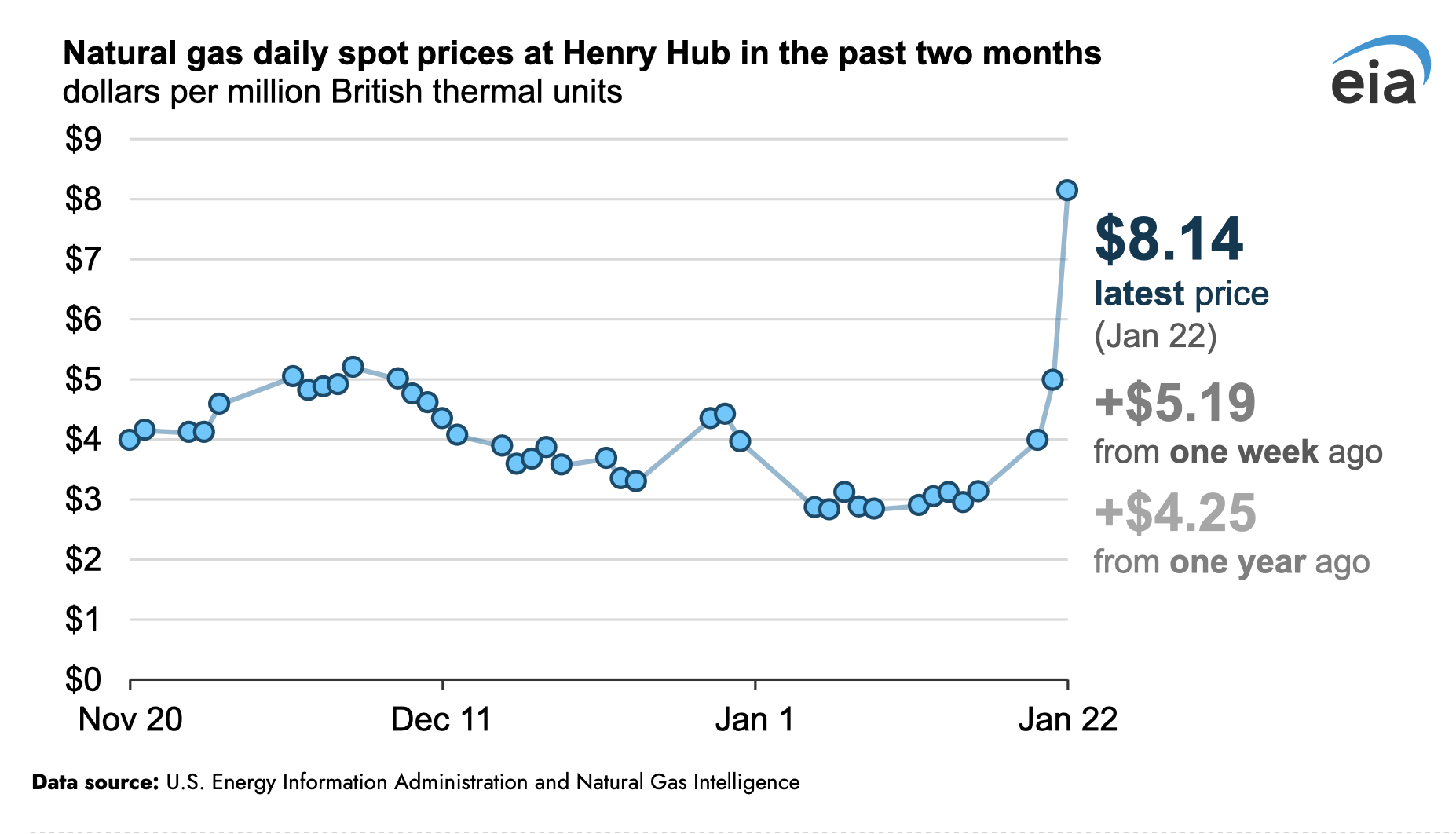 Los precios spot diarios del gas natural en el índice de referencia Henry Hub aumentaron considerablemente la semana pasada, alcanzando casi los 8.15 dólares por millón de unidades térmicas británicas (MMBtu), el 22 de enero, debido a que el clima más frío incrementó la demanda de calefacción en todo el país. El aumento de los precios mayoristas del gas natural generalmente contribuye al aumento de los precios mayoristas de la electricidad.