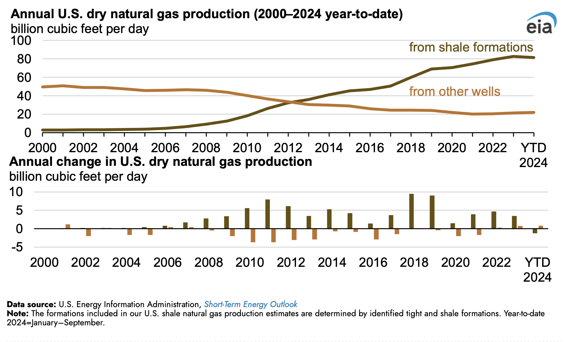 La producción de gas natural de los Estados Unidos a partir de formaciones de esquisto y estrechas, que representa el 79 % de la producción de gas natural seco, disminuyó ligeramente en los primeros nueve meses de 2024 en comparación con el mismo período de 2023. Si esta tendencia se mantiene durante el resto de 2024, marcaría la primera disminución anual en la producción de gas de esquisto de EE. UU. desde que comenzamos a recopilar estos datos en 2000.