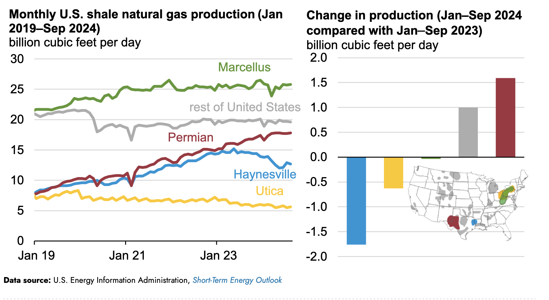 La disminución en la producción de gas de esquisto en lo que va del año se ha debido principalmente a la disminución de la producción en Haynesville y Uticaplays. De enero a septiembre de 2024, la producción de gas de esquisto disminuyó en un 12 % (1.8 Bcf/d) en Haynesville y en un 10 % (0.6 Bcf/d) en Utica en comparación con el mismo período de 2023. Al mismo tiempo, la producción de gas de esquisto en el juego del Pérmico creció un 10% (1.6 Bcf/d). La producción en la obra de Marcellus, que lidera la producción de gas de esquisto de EE. UU., se mantuvo plana.