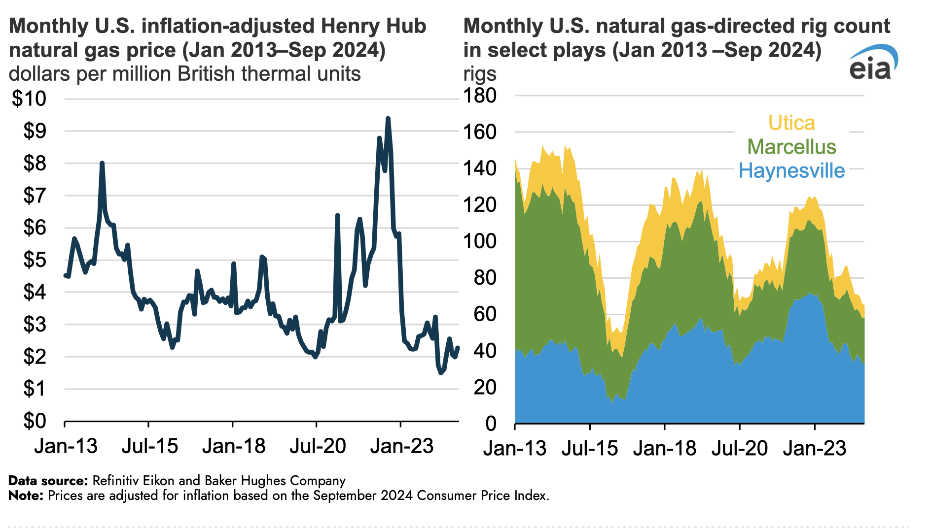 El precio del gas natural Henry Hub de referencia de EE. UU. cayó un 79 % desde el máximo ajustado a la inflación de agosto de 2022 de 9.39 dólares por millón de unidades térmicas británicas (MMBtu) a un promedio de 1.99 dólares/MMBtu en agosto de 2024. En lo que va de año, el precio ha promediado 2.10 $/MMBtu en comparación con un promedio ajustado a la inflación de 6.89 $/MMBtu en 2022 y 2.62 $/MMBtu en 2023. A medida que los precios del gas natural disminuyeron, la economía de producir gas natural en las formaciones de gas seco empeoró, lo que llevó a los productores a cerrar la producción y abandonar las plataformas de perforación.