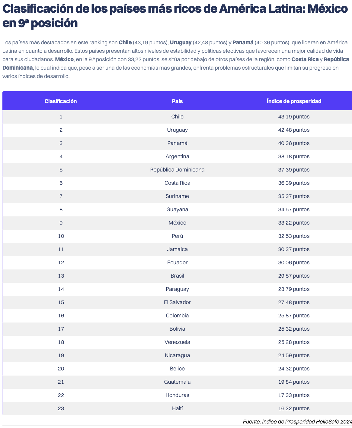 Con una puntuación de 33.22 puntos, México es el 9º país más próspero de América Latina, después de Guayana, República Dominicana y Suriname, informó HelloSafe.