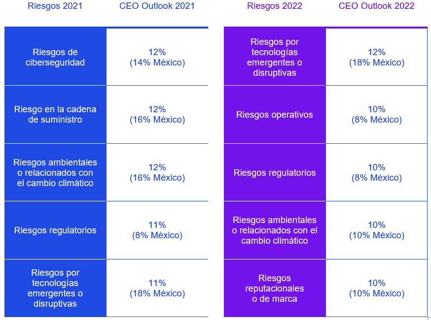 La ciberseguridad ha caído de los cinco principales riesgos para el crecimiento durante 2022, con solo 6% (8% México) nombrándolo su principal riesgo. Sin embargo, el ambiente informático evoluciona y 76% (86% México) indica que su organización ve la ciberseguridad como una función estratégica y como una posible fuente de ventaja competitiva. La incertidumbre geopolítica también genera inquietudes de ciberataques corporativos, de acuerdo con siete de cada diez encuestados (72% Global, 76% México). Casi cerca de tres cuartas partes de las organizaciones (71% Global, 76% México) tienen un plan para manejar ataques de ransomware. Sin embargo, más CEO reconocen que no están bien preparados para un ataque cibernético, con aproximadamente una cuarta parte (23% Global, 4% México) que así lo admite en 2022, en comparación con 13% Global en 2021.