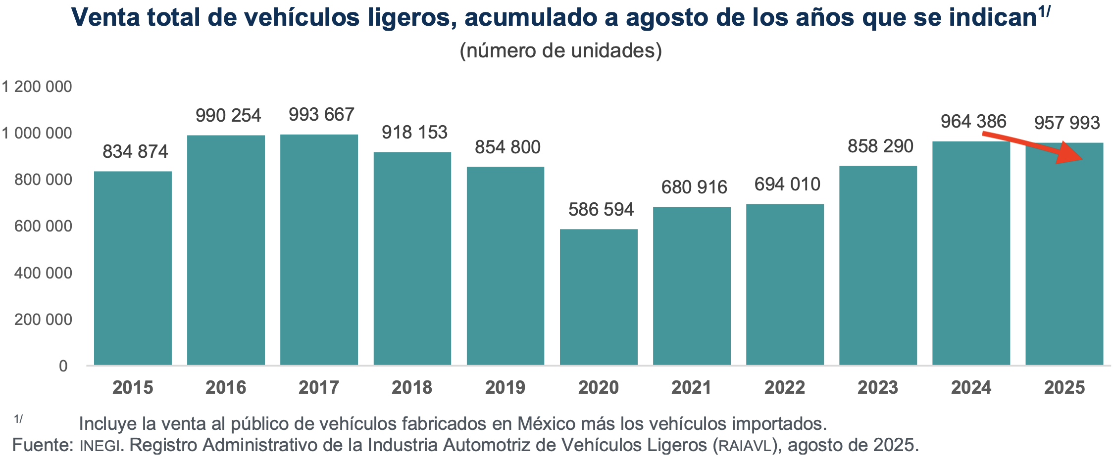 De acuerdo con información del Resultados del Registro Administrativo de la Industria Automotriz de Vehículos Ligeros (RAIAVL), en el acumulado de agosto-enero, las ventas sumaron 975,953 unidades, con una baja de 0.7%, lo que significa la primera baja para un periodo similar en los últimos cinco años.