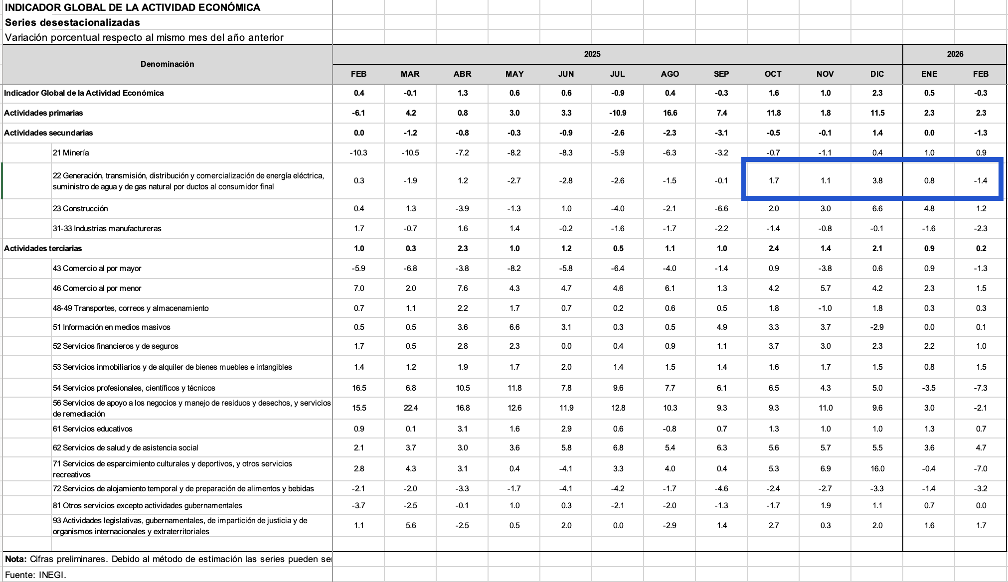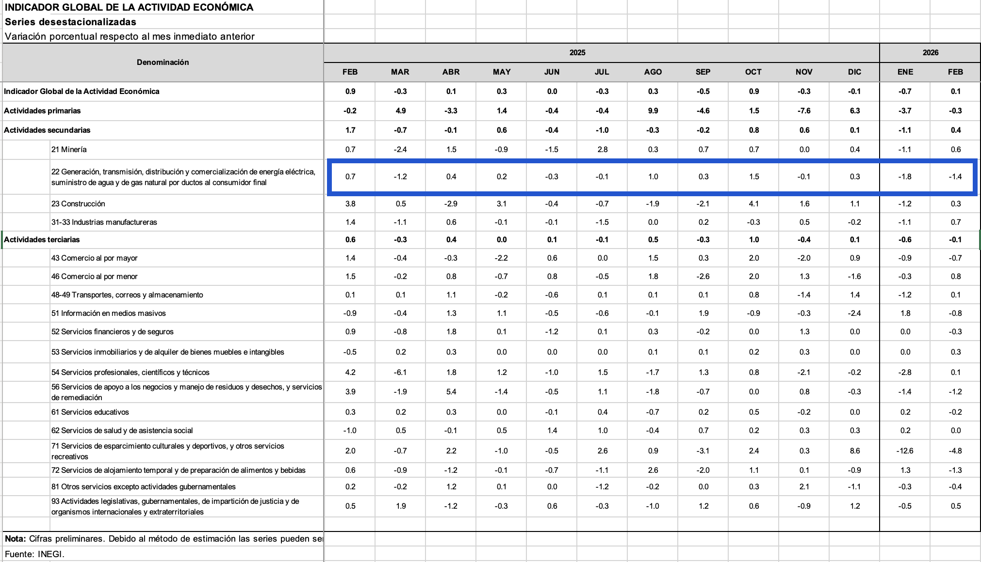 Durante febrero de 2026, el sector de generación, transmisión, distribución y comercialización de energía eléctrica, suministro de agua y de gas natural por ductos al consumidor final, reporta una caída de -1.4% en términos reales, en contraste, el Indicador Global de la Actividad Económica (IGAE) registra un pequeño avance de 0.1%.